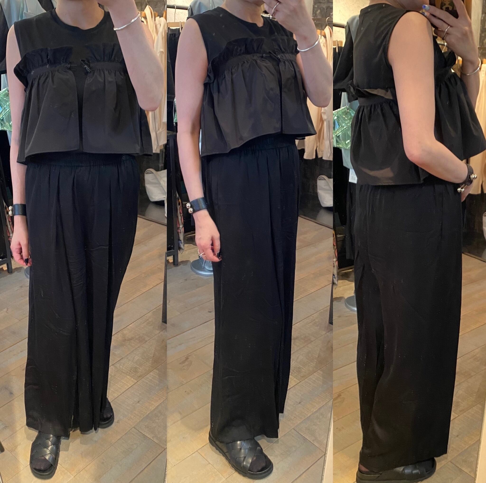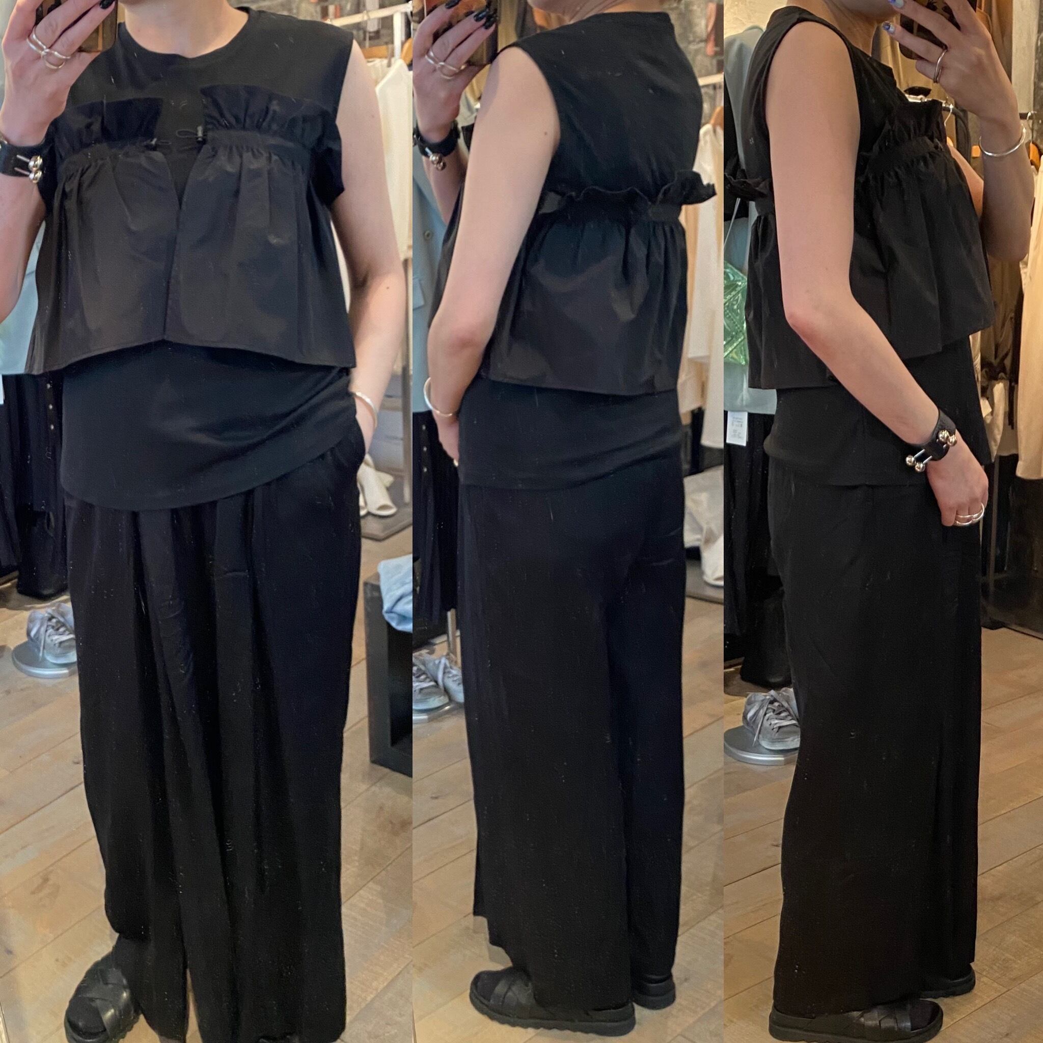 異素材のドッキングが特徴的なカットソー。ビスチェがスリーブレスカットソーにレイヤードされたデザイン。フロント部分のドローコードでフィット感のシルエットを変えて頂けます。サラッと着用するだけでスタイリングが完結するオススメカットソーです♪