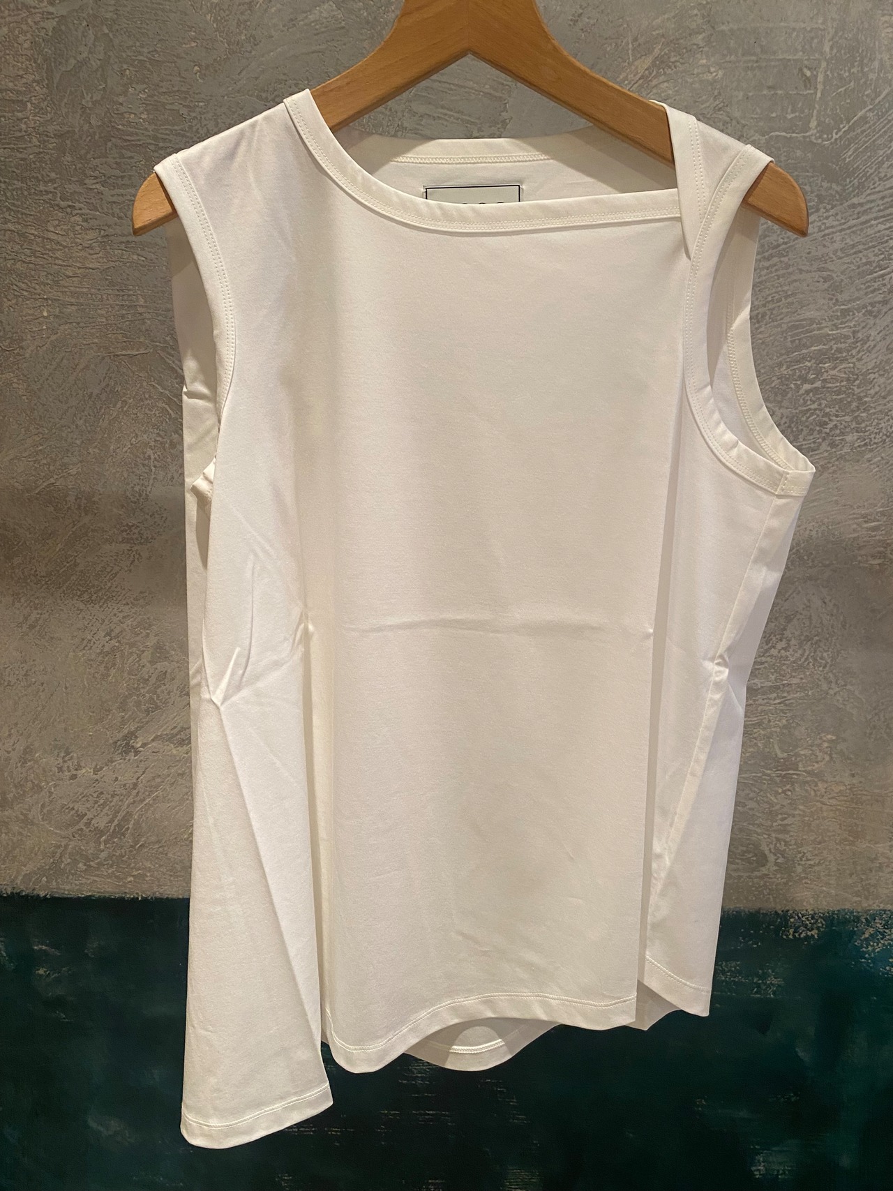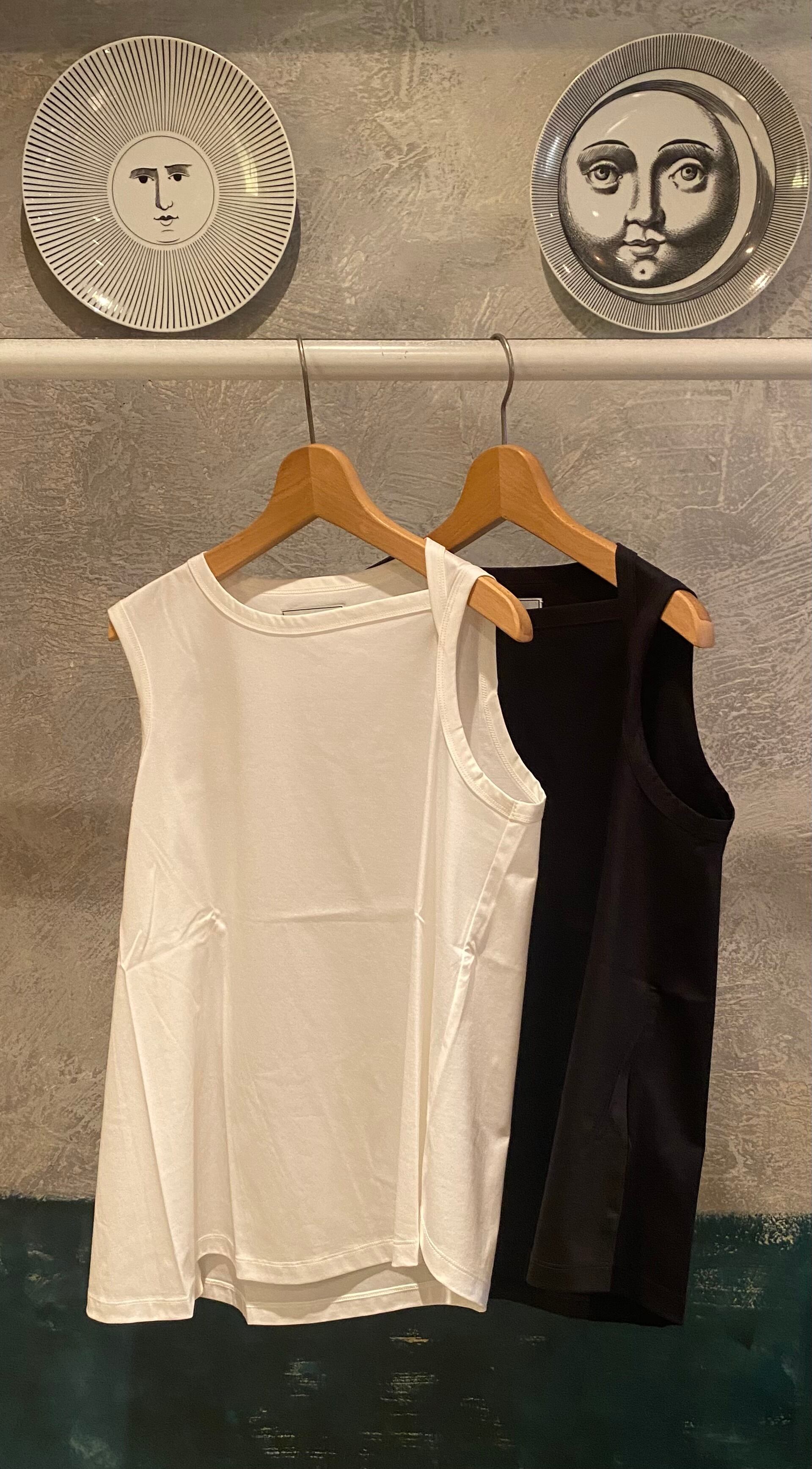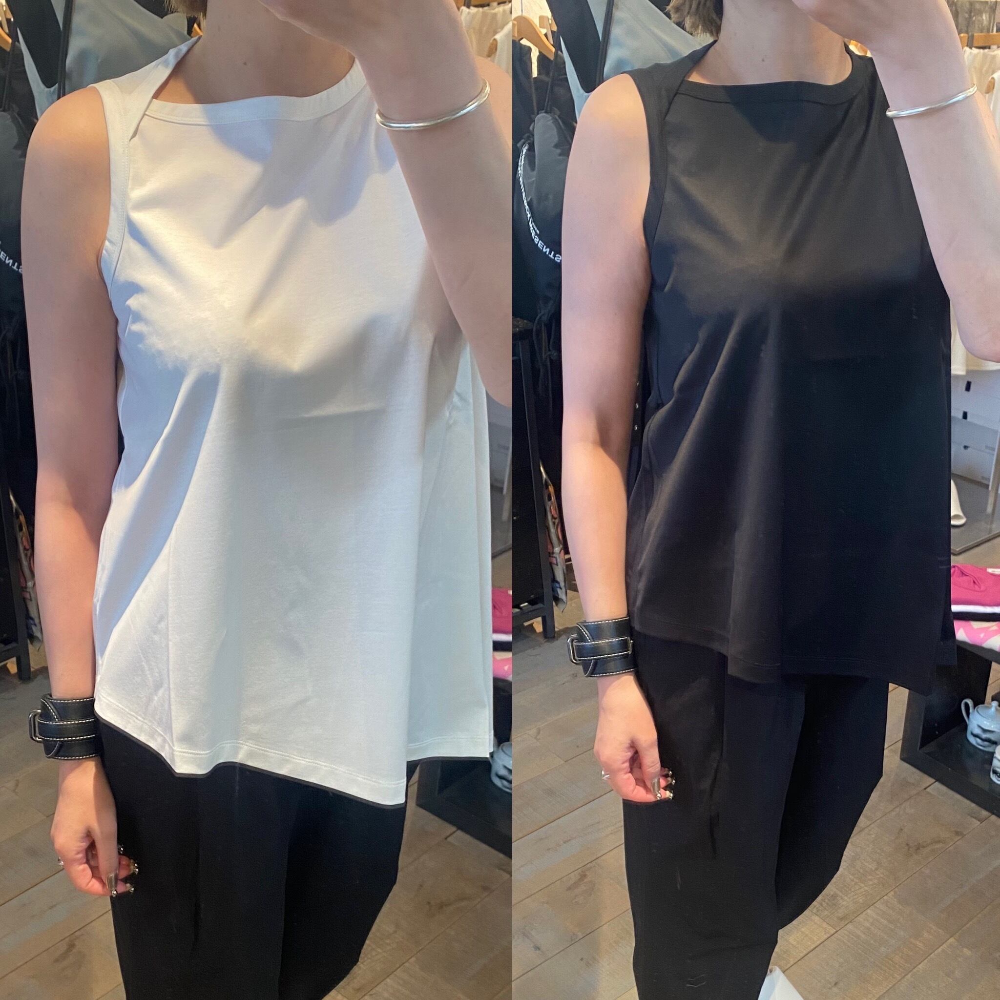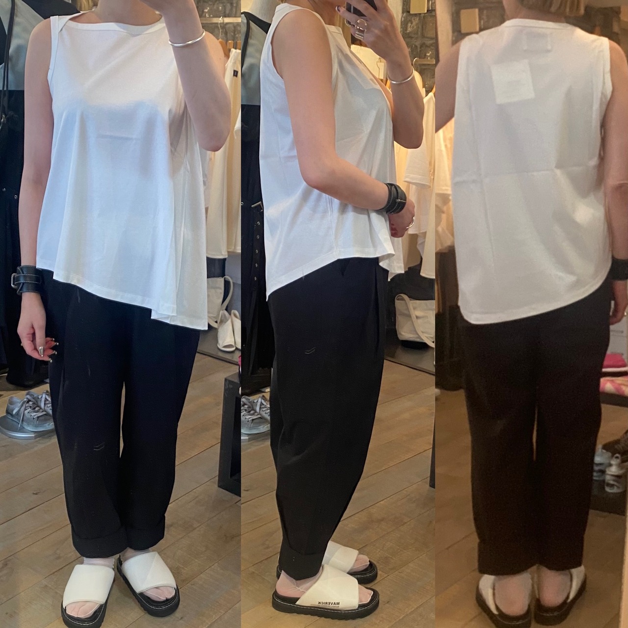 アシンメトリーなデザインが特徴のノースリーブカットソー。艶感のあるキレイめ見えするコットン素材で着心地も◎さりげないデザインもポイントに♪
