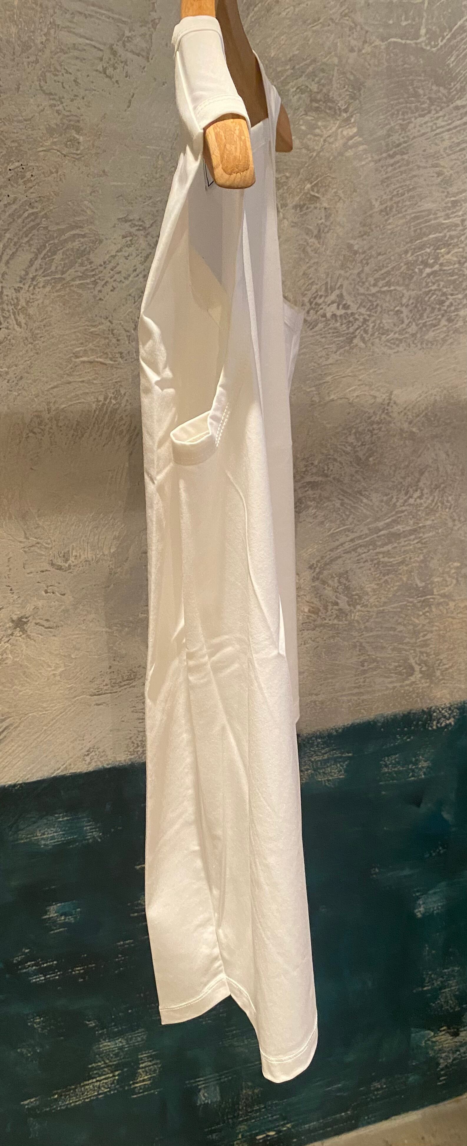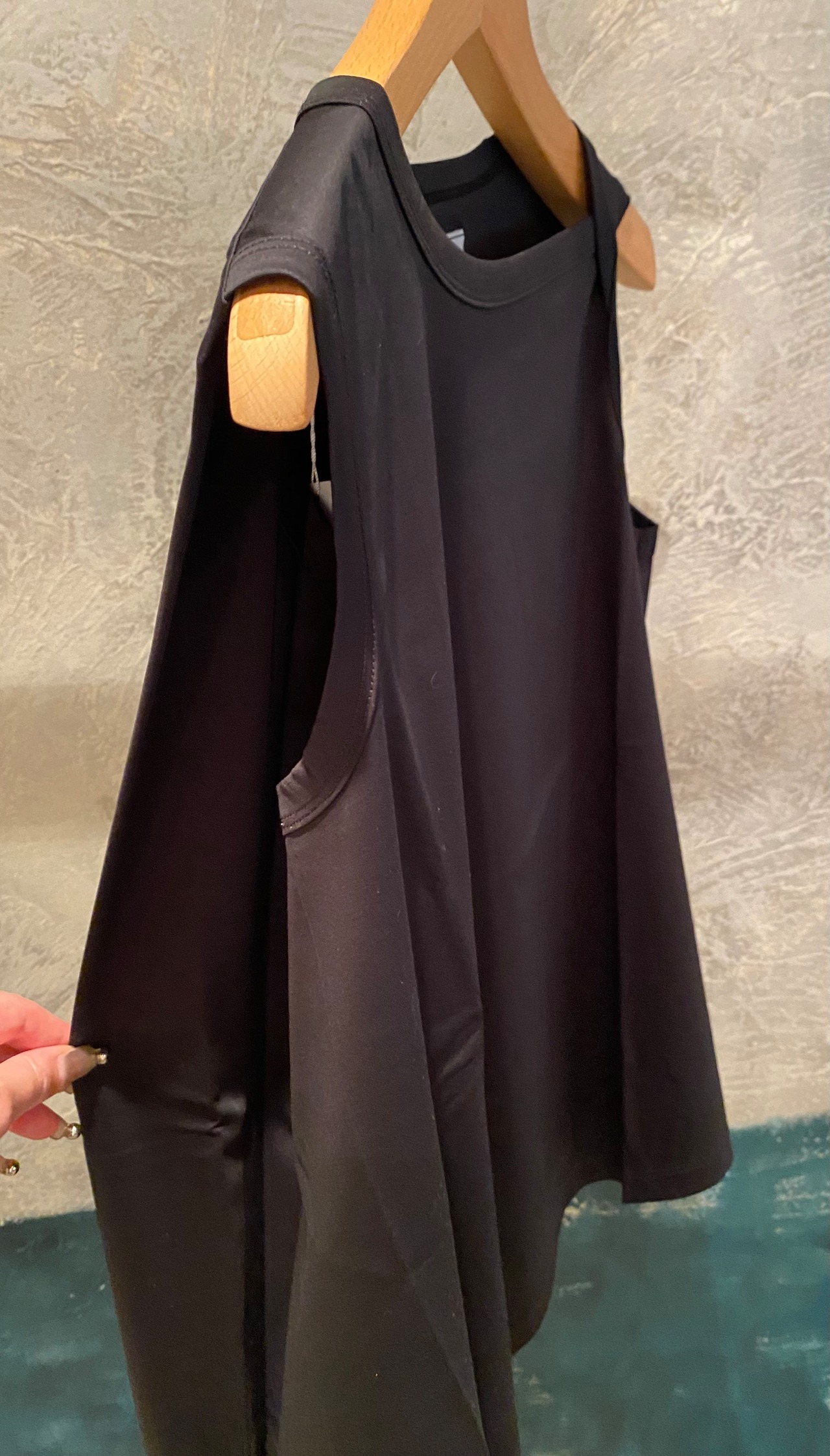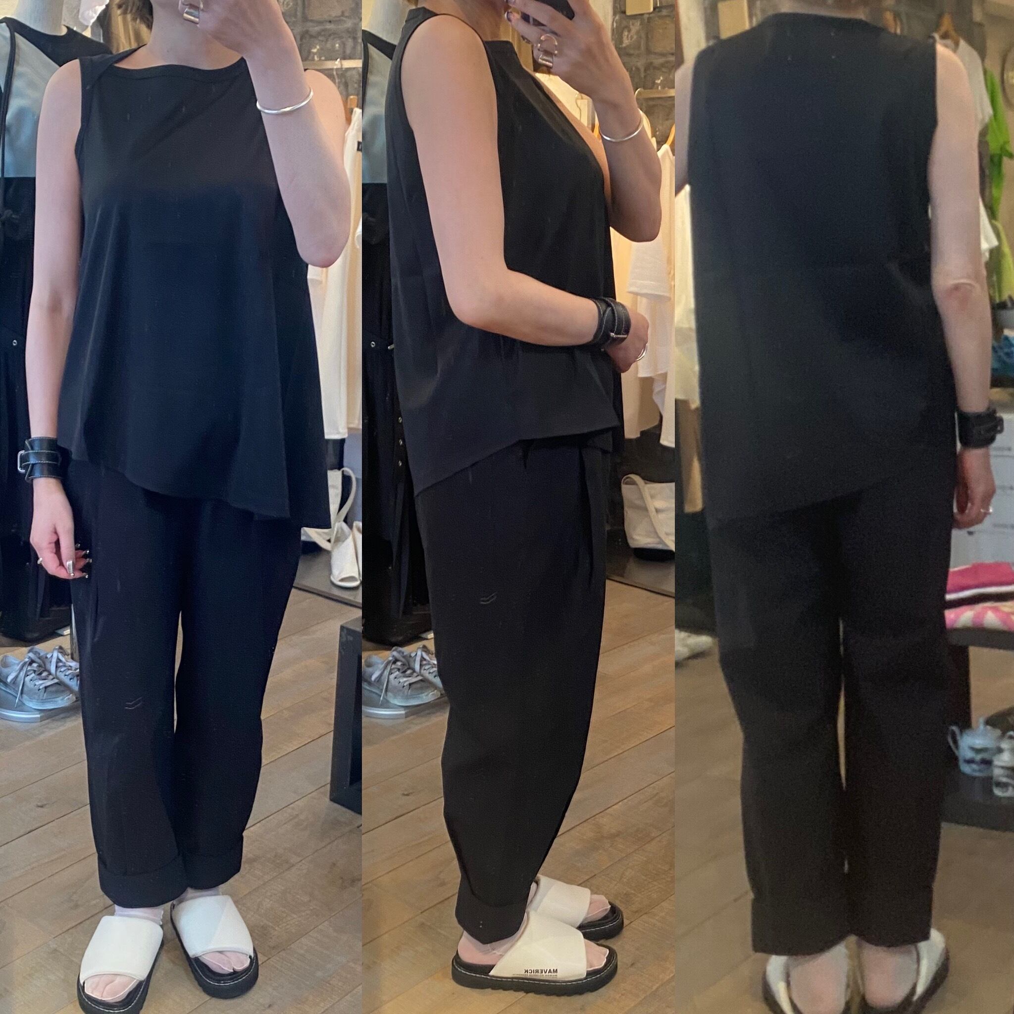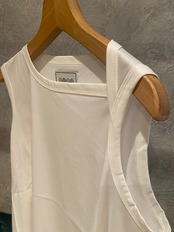 アシンメトリーなデザインが特徴のノースリーブカットソー。艶感のあるキレイめ見えするコットン素材で着心地も◎さりげないデザインもポイントに♪