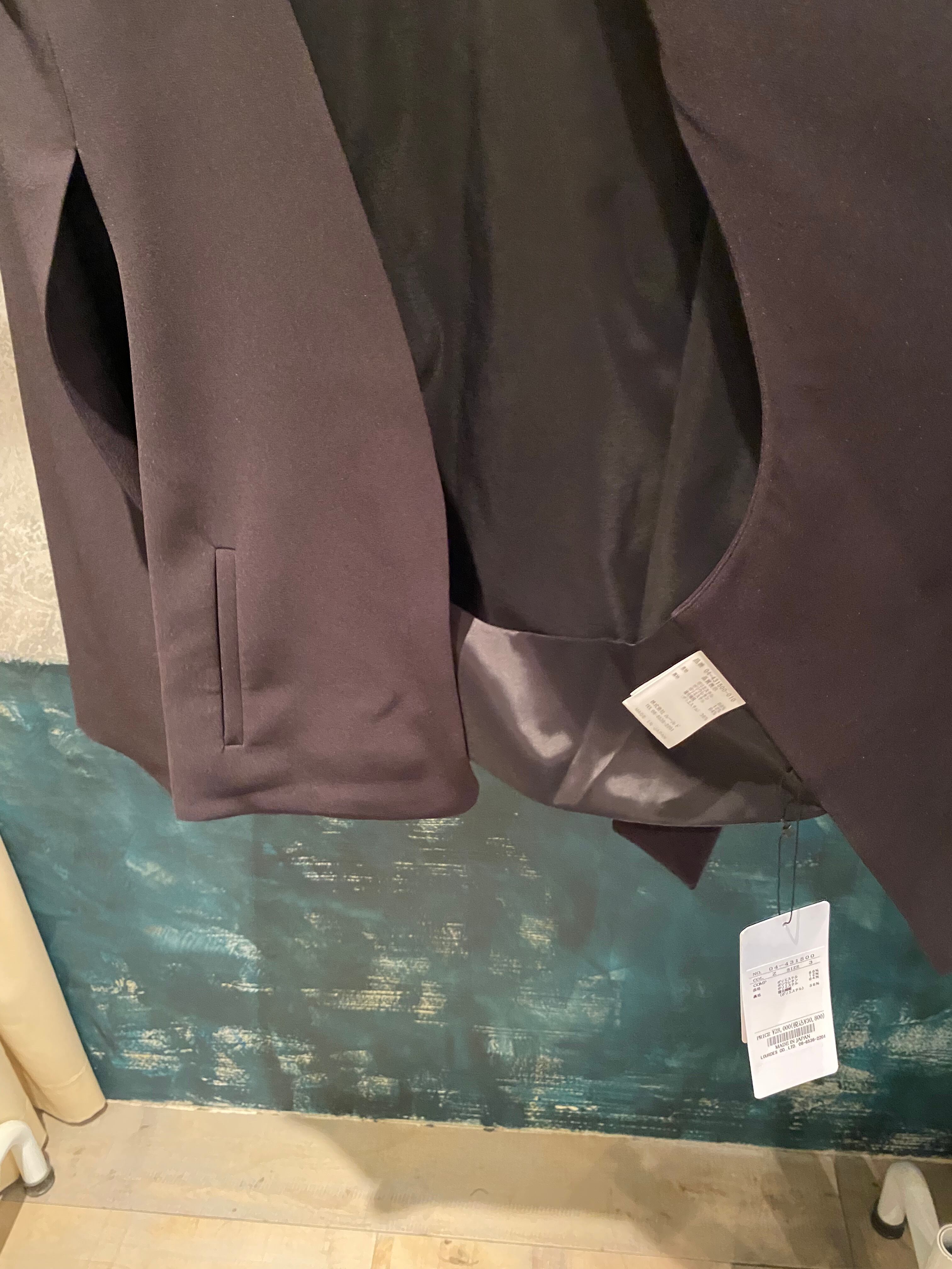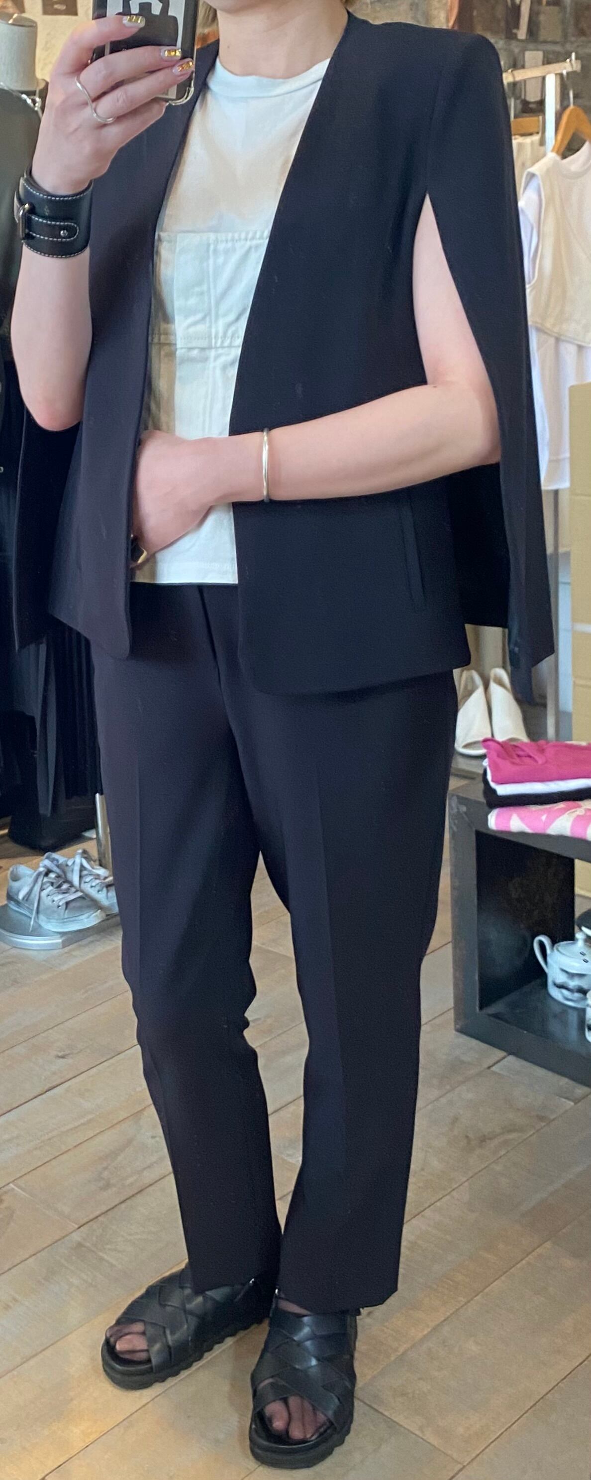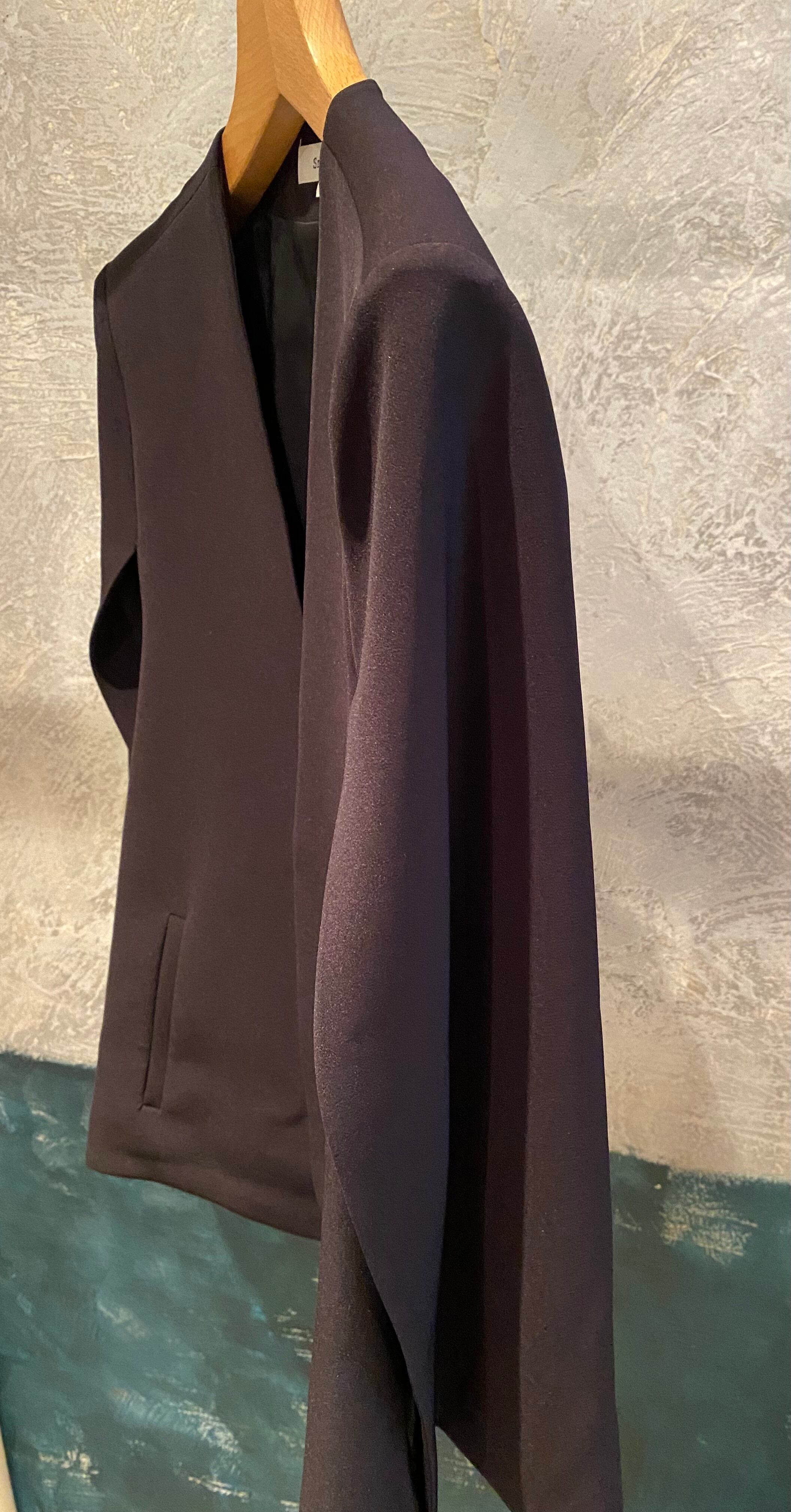大人の上品さが漂うケープジャケット。ネックラインに沿ったスッキリとした深めのVカットラインがスッキリとした印象です。カジュアルなボトムでもコーディネートをシャープに演出してくれます♪同素材のパンツと合わせるセットアップも◎ダブルクロス、伸縮性もあり着心地抜群。肩がけでも落ちないような構造に仕立てられてます。
