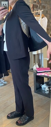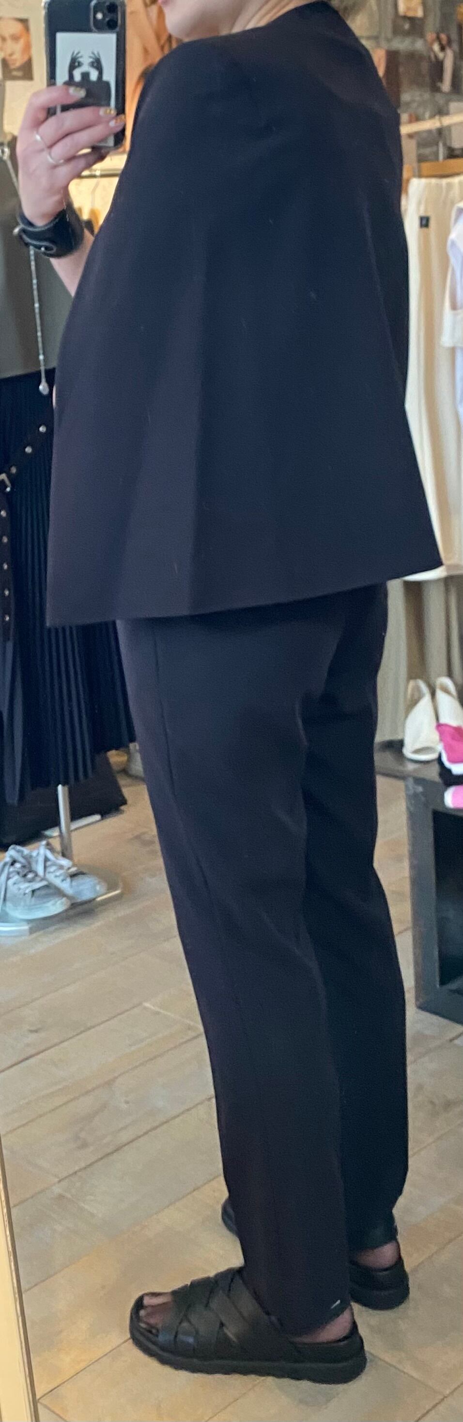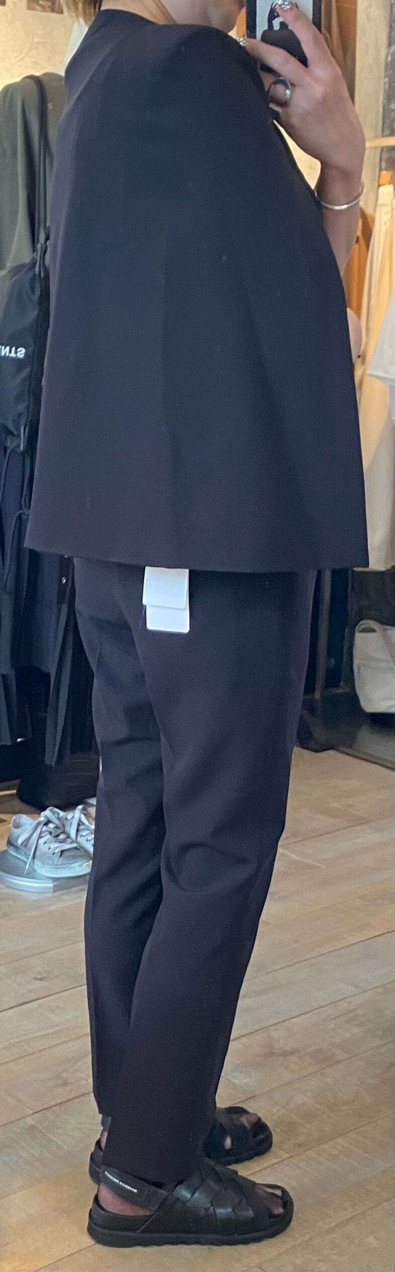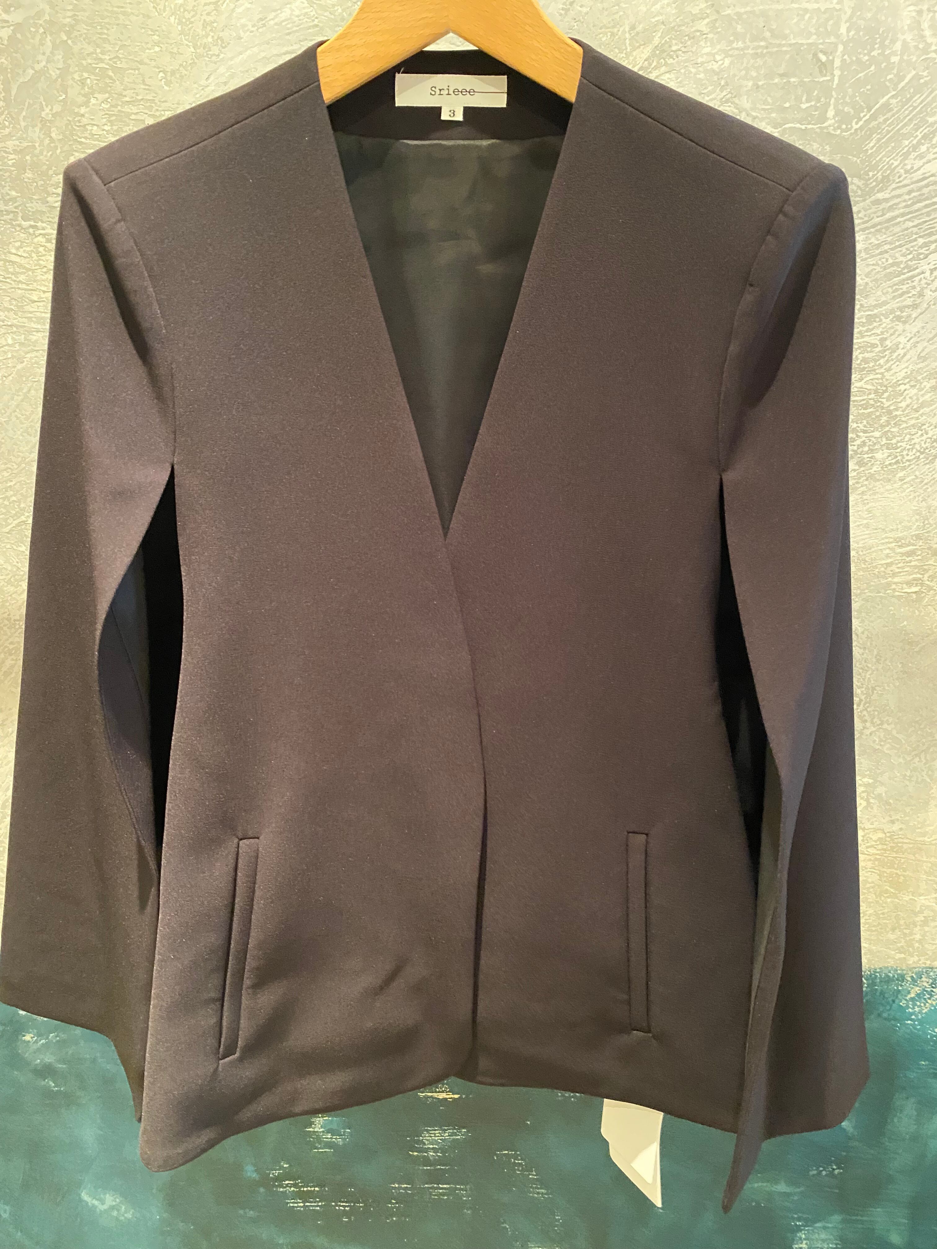 大人の上品さが漂うケープジャケット。ネックラインに沿ったスッキリとした深めのVカットラインがスッキリとした印象です。カジュアルなボトムでもコーディネートをシャープに演出してくれます♪同素材のパンツと合わせるセットアップも◎ダブルクロス、伸縮性もあり着心地抜群。肩がけでも落ちないような構造に仕立てられてます。
