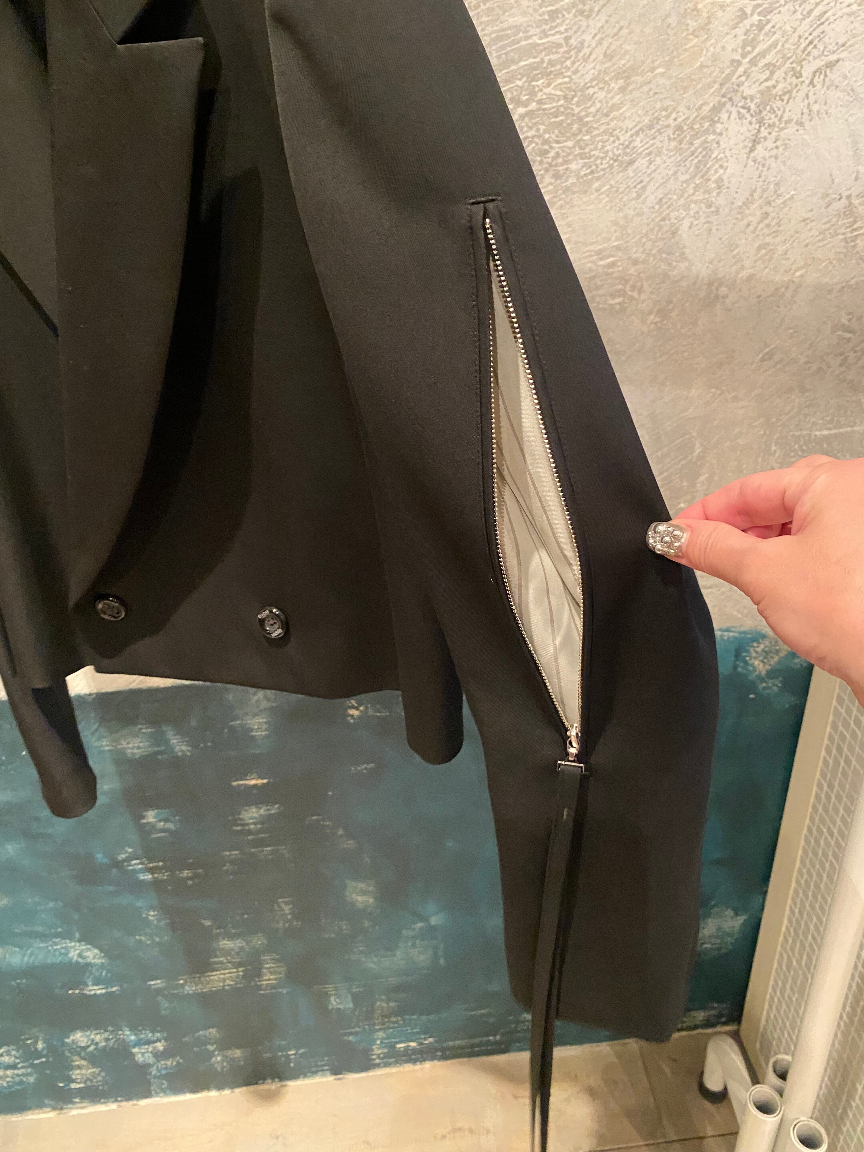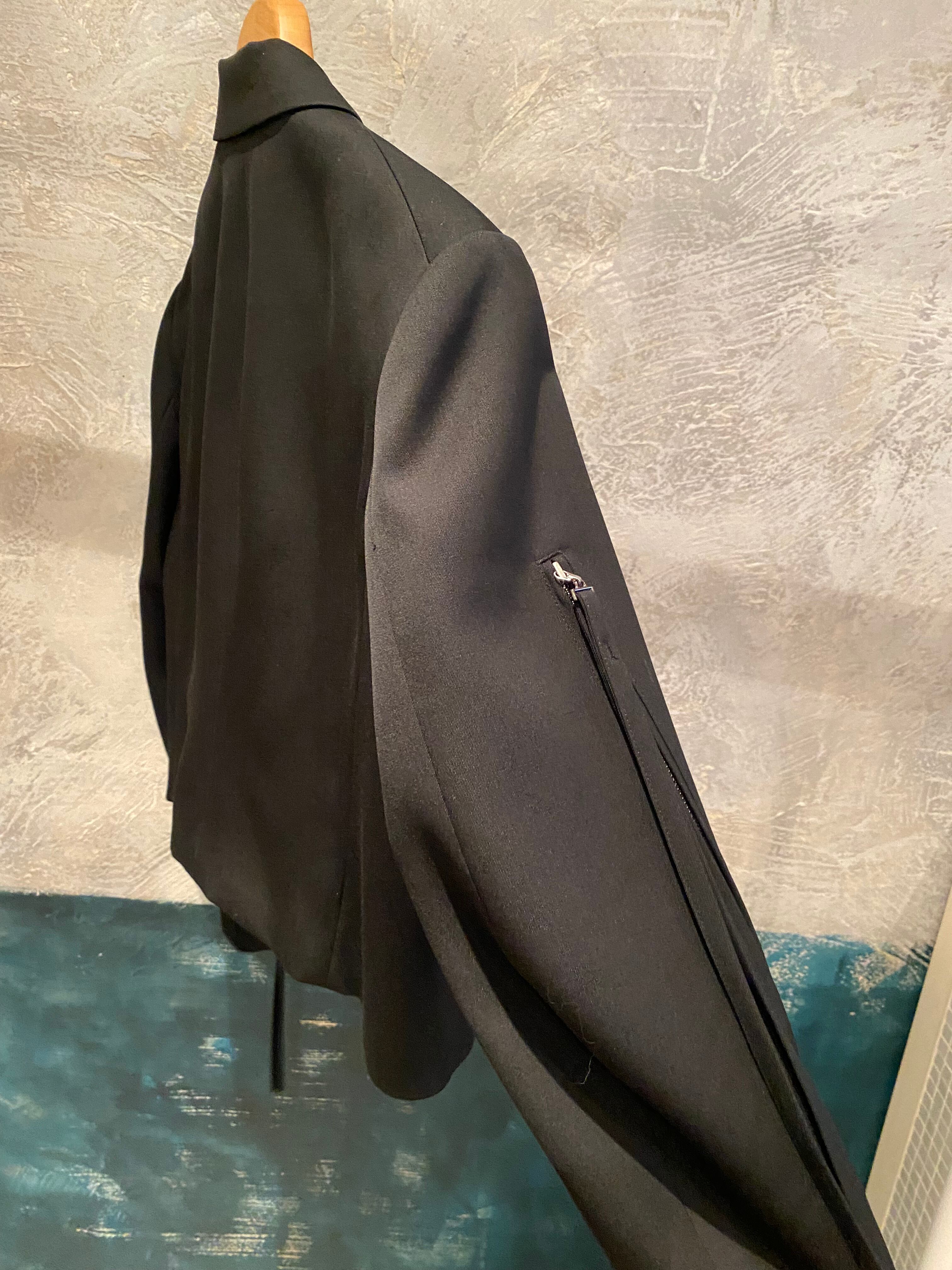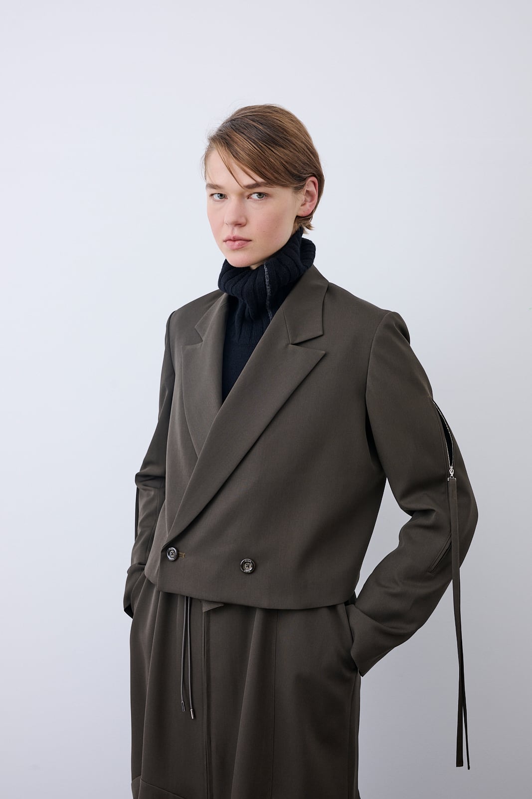 袖に施された両玉縁布のファスナースリットが特徴的なデザインのジャケット。マニッシュなムード漂うクリーンな印象に仕上げています。袖のスリットから腕を出せるユニークなデザインです。
