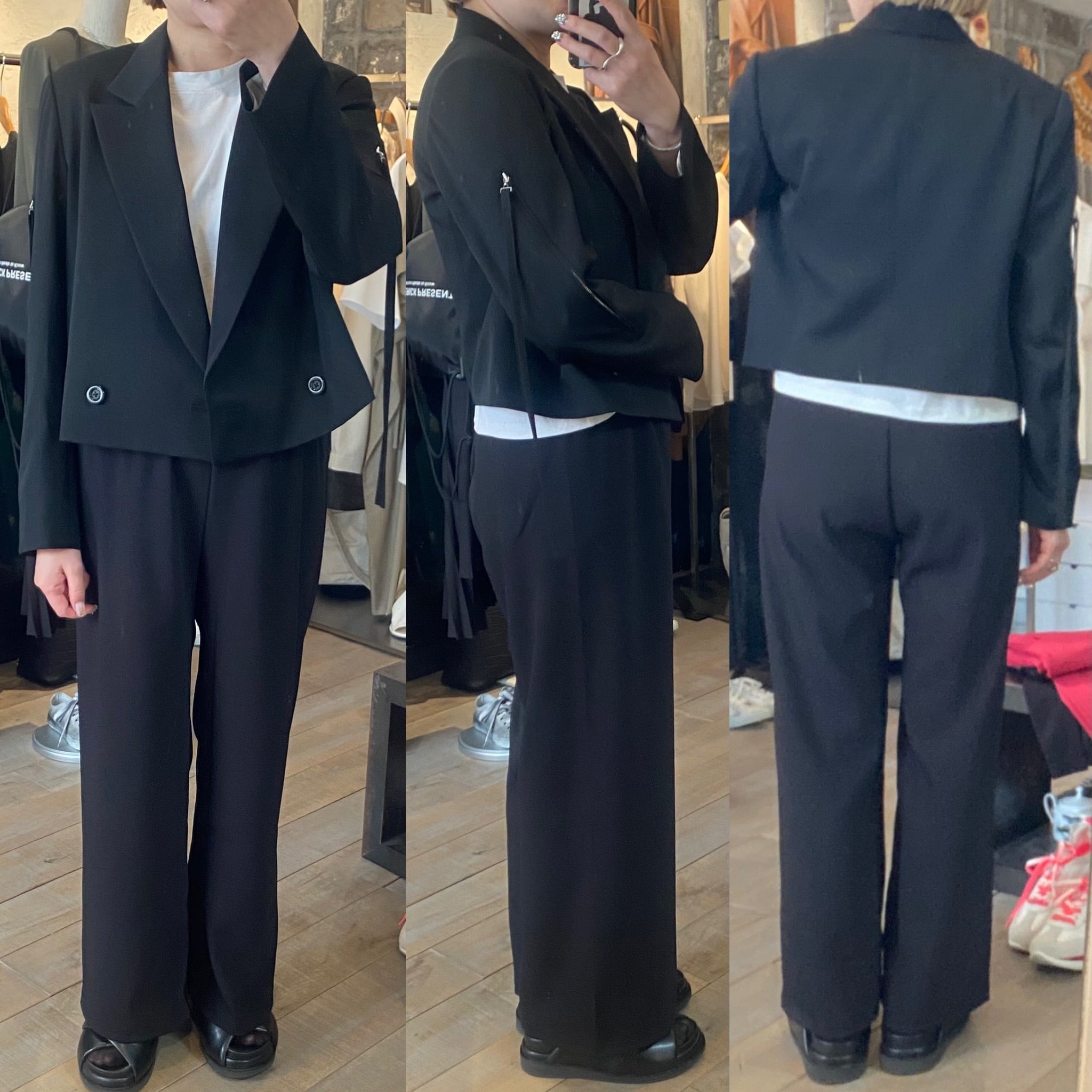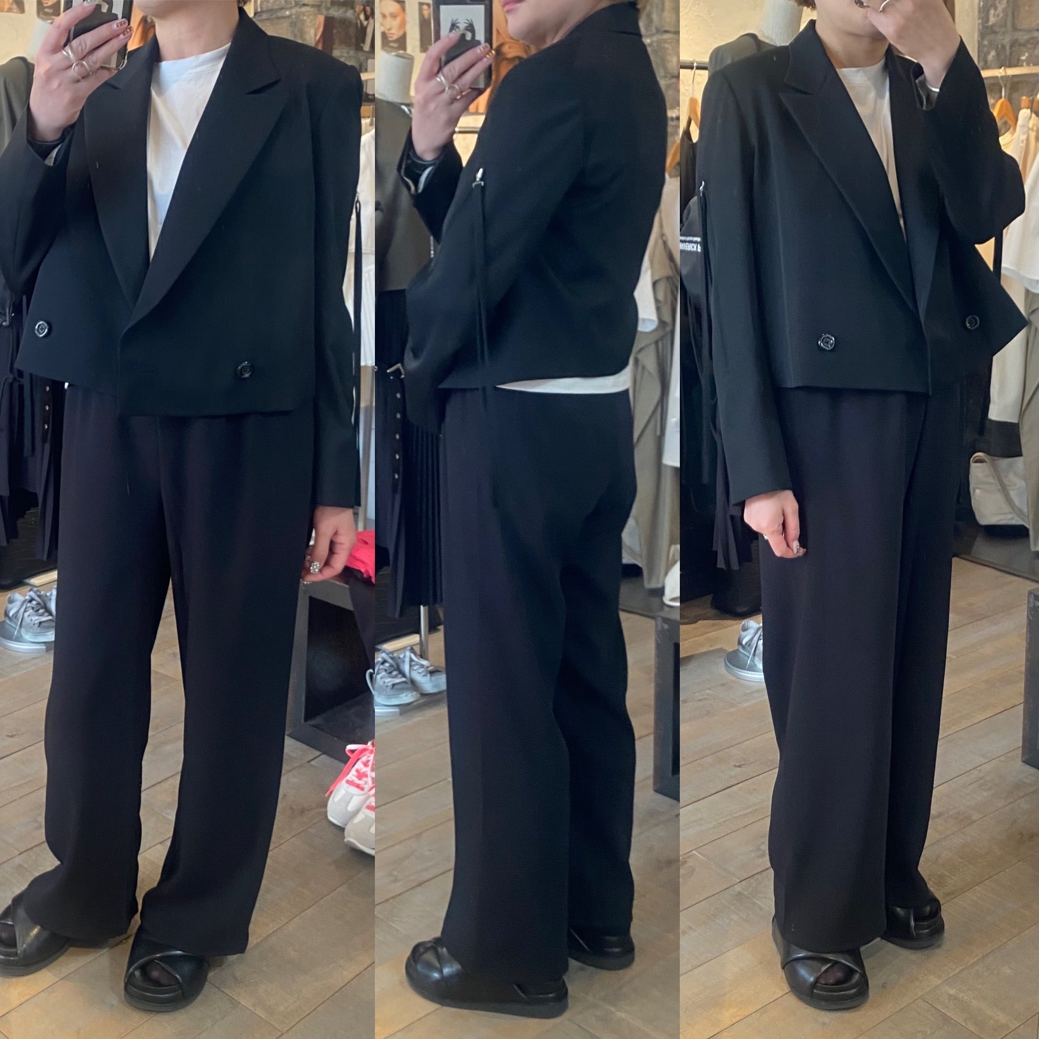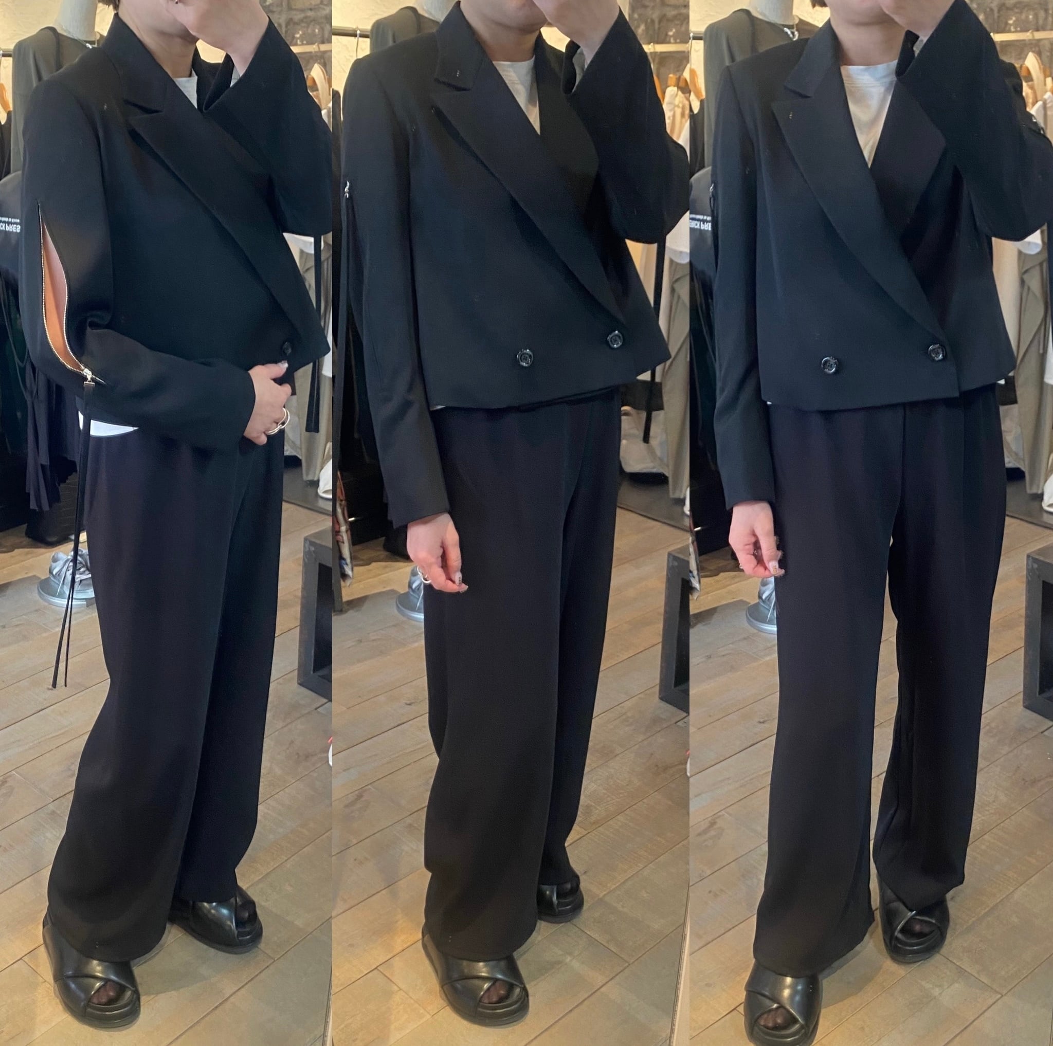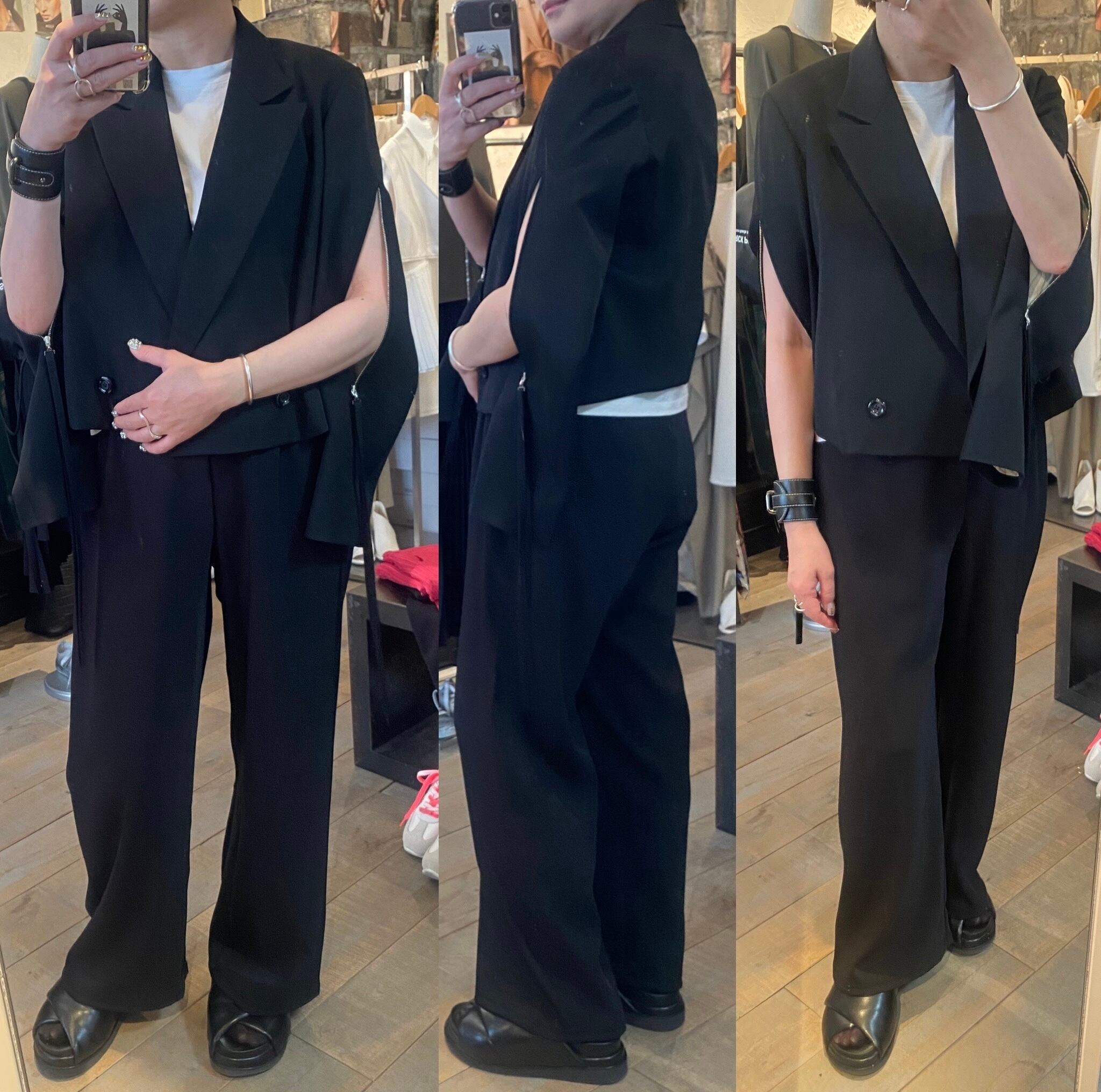 袖に施された両玉縁布のファスナースリットが特徴的なデザインのジャケット。マニッシュなムード漂うクリーンな印象に仕上げています。袖のスリットから腕を出せるユニークなデザインです。