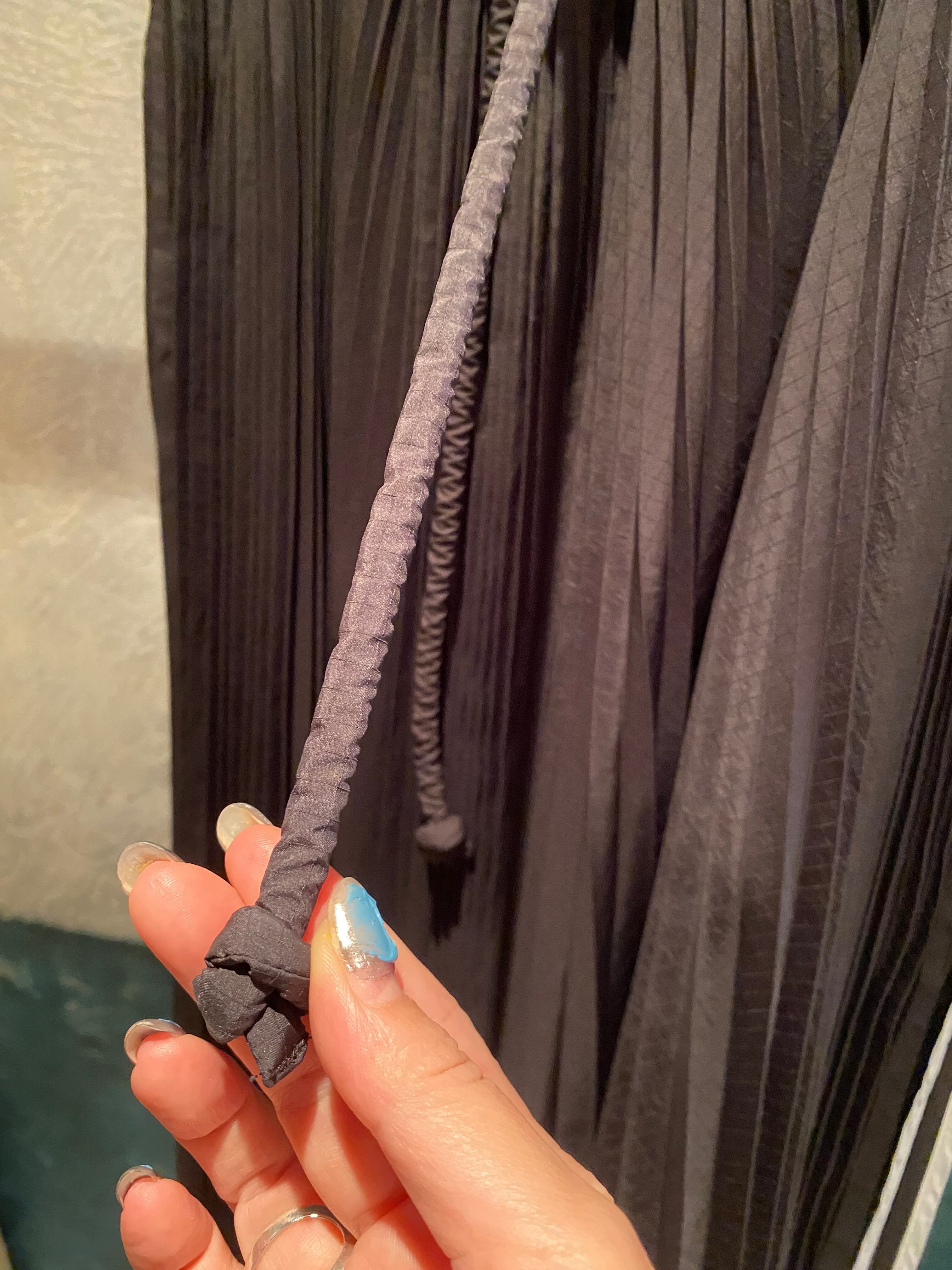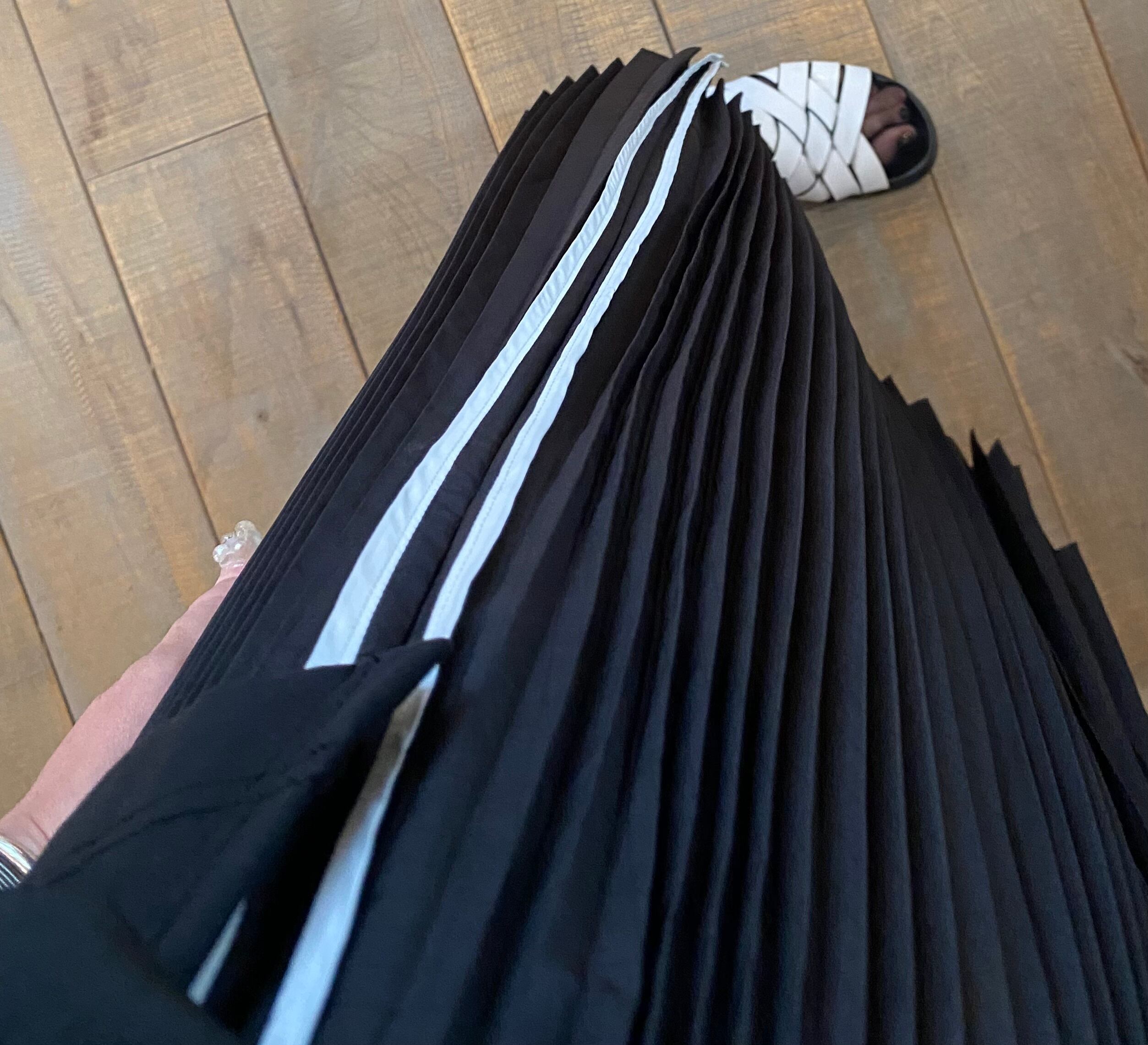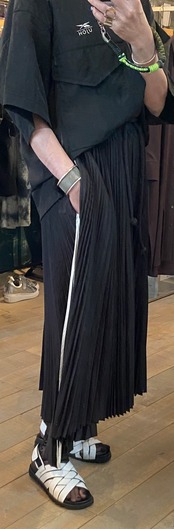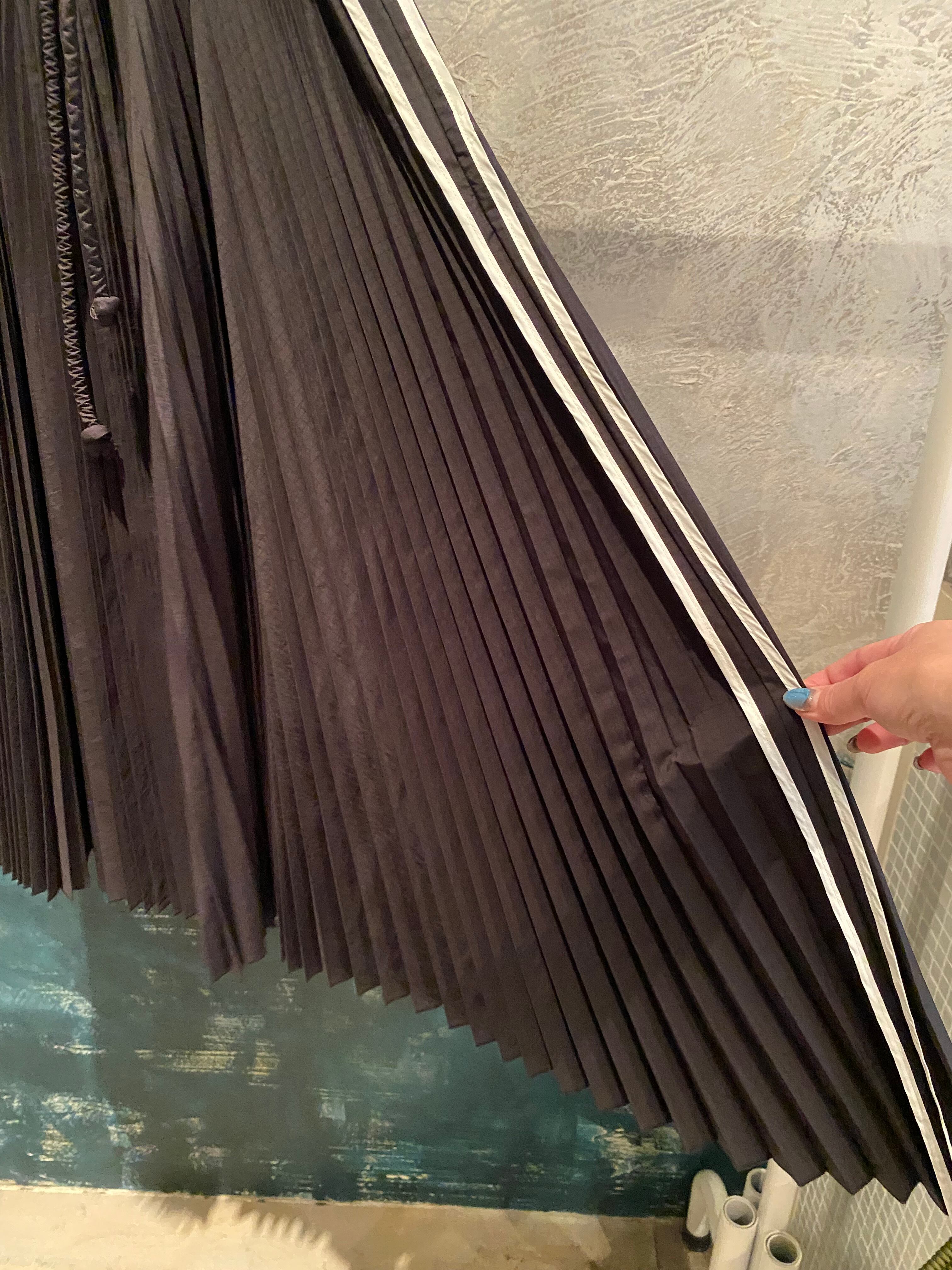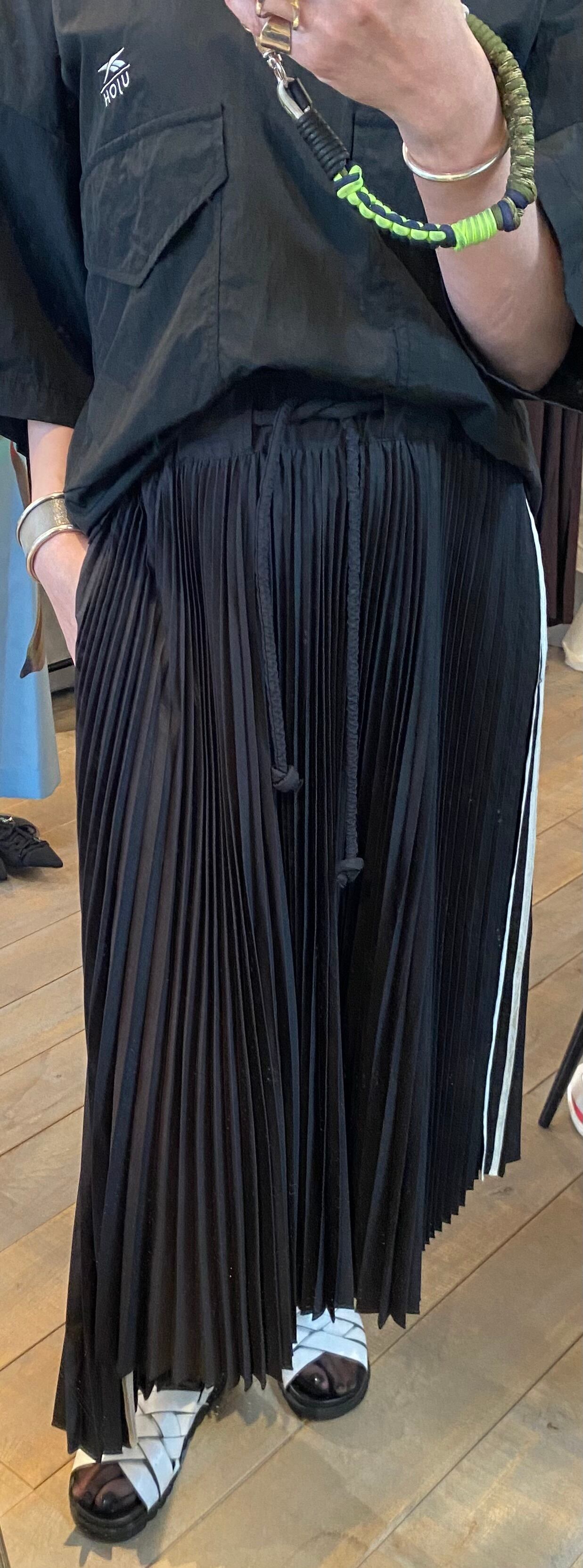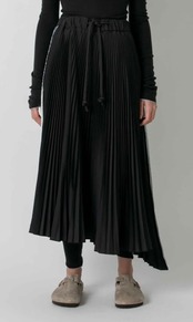 プリーツスカートは、ボリューム感のあるアコーディオンプリーツで、長さがアシンメトリーになっている為、揺れるたびにエレガントな動きを演出してくれます。両脇のパイピングと、ウエスストの紐も太いコードがアクセントになっています。