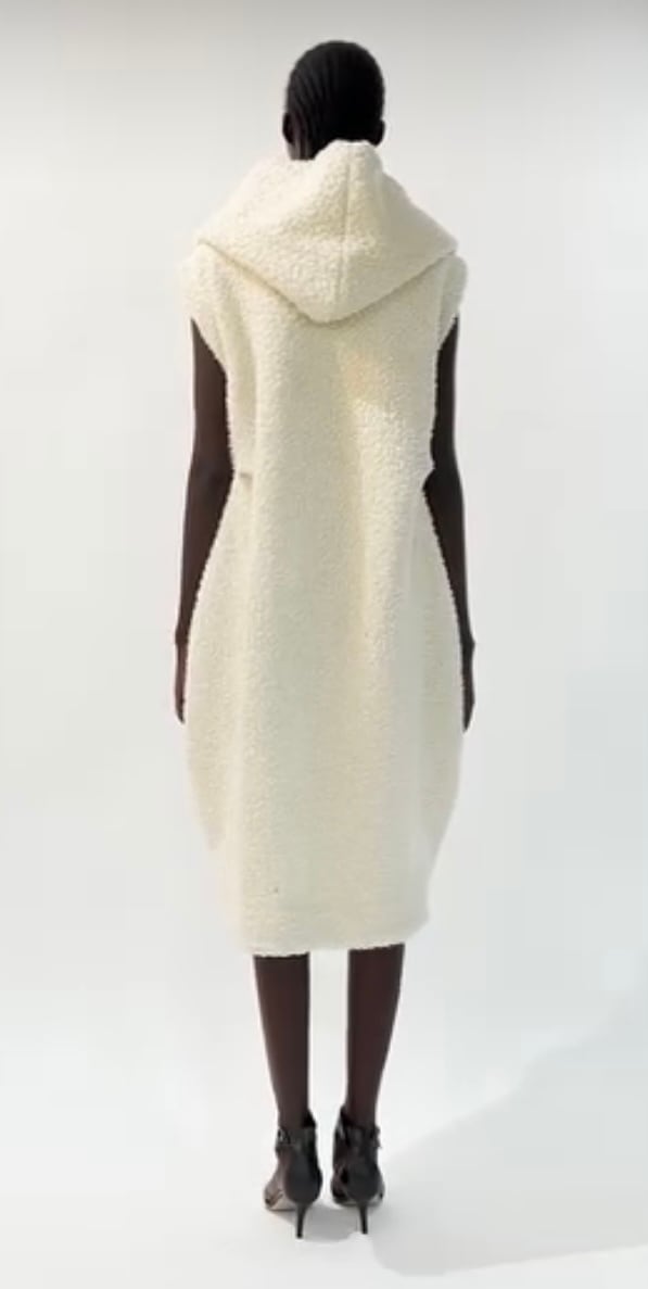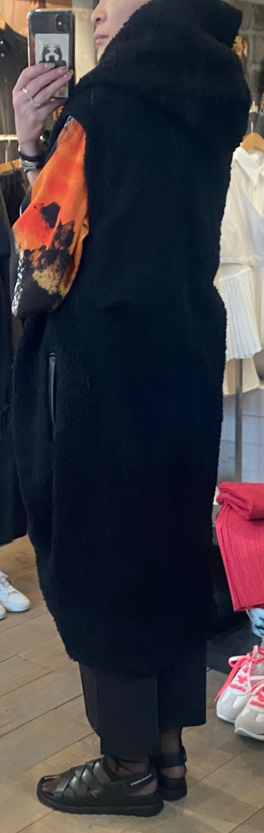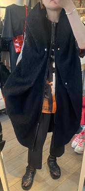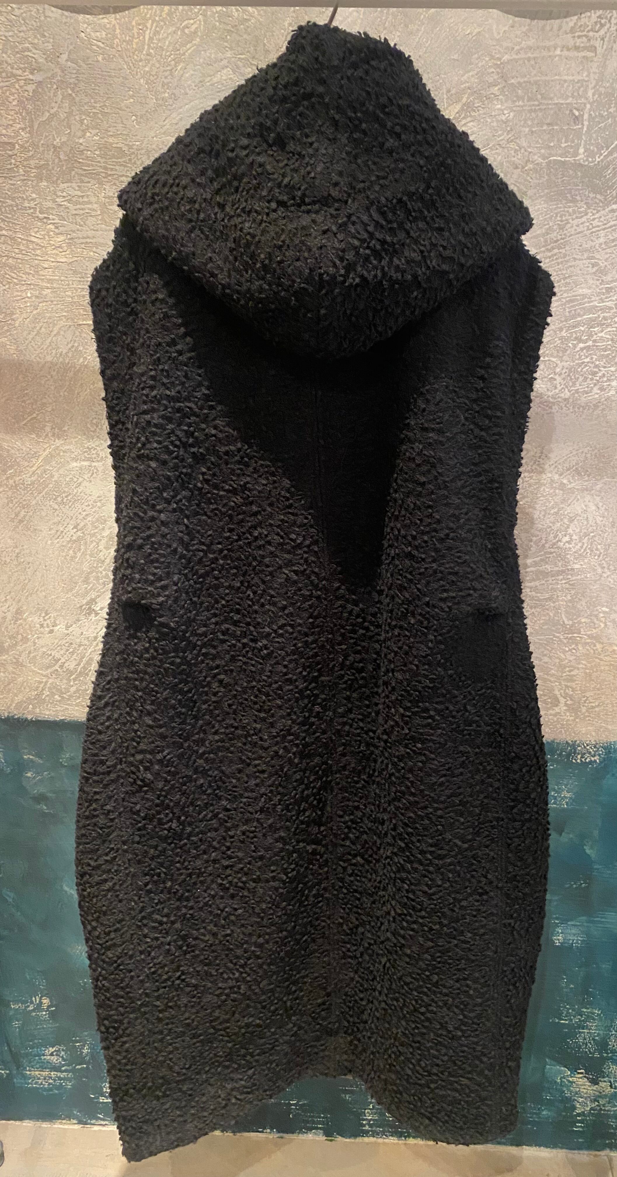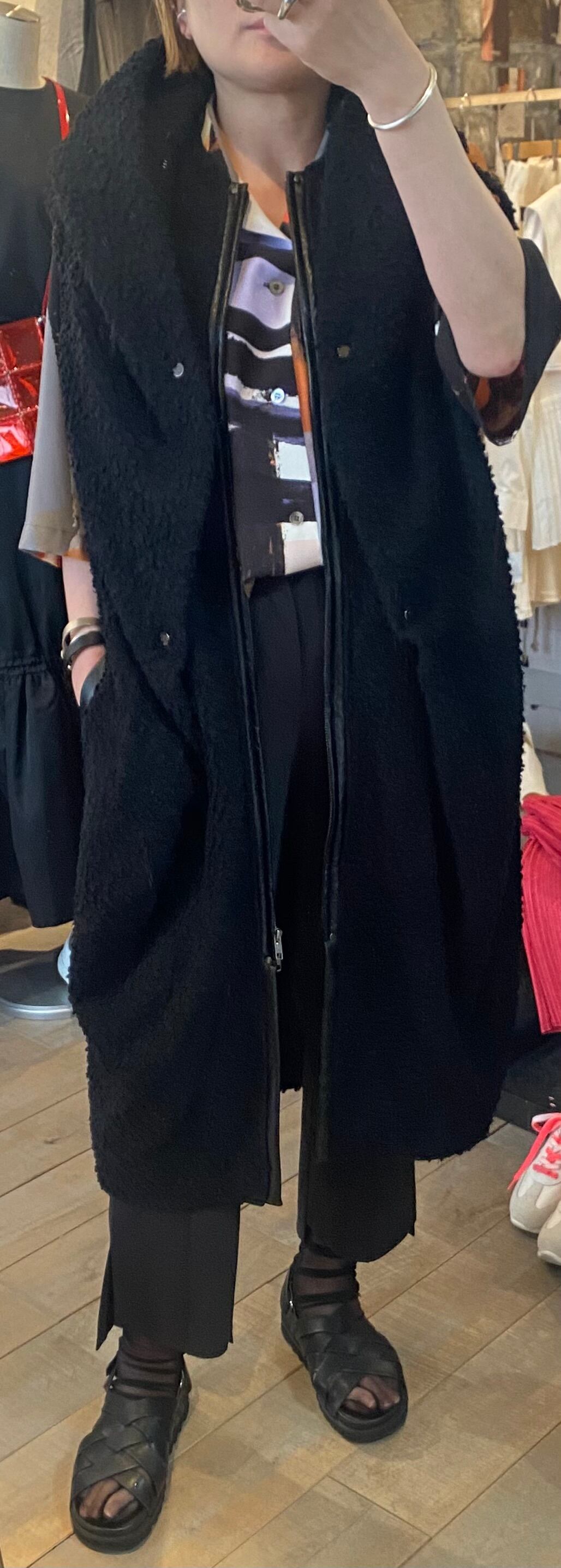 前見頃がレイヤードのようなデザインのフード付きスリーブレスコート。前端にはエコレザーを使用しています。前ファスナー開き。ポケット2つあり。