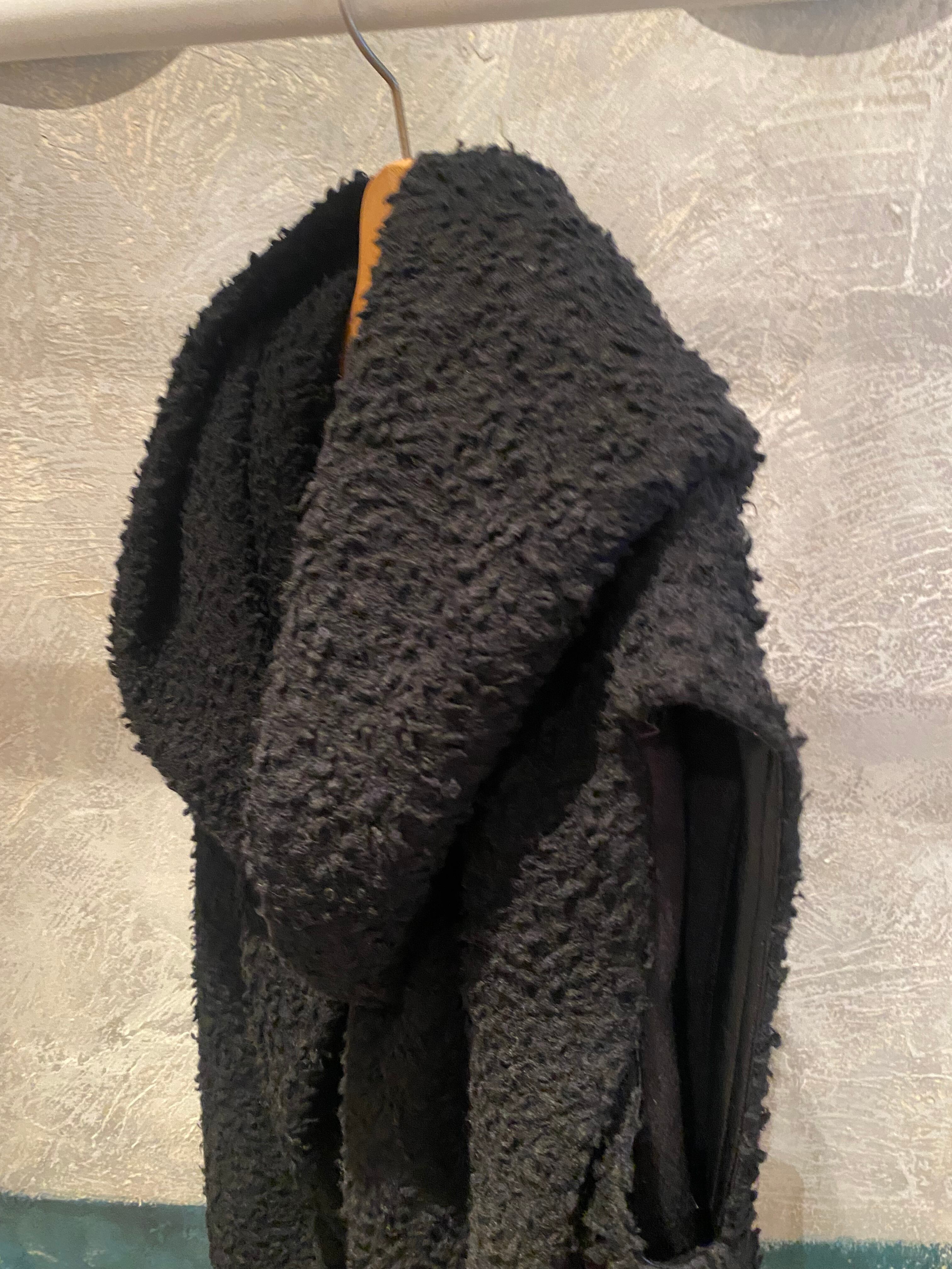 素材は、表には48双糸のウール、裏には綿を使用し、表はウール、裏は綿の表情になっています。和歌山にて希少な編み機で1日に一反ゆっくり編む事で、ふっくらとした生地に仕上げています。ワッシャーをかけることにより、独特なドレッドのようなボアを表現しています。