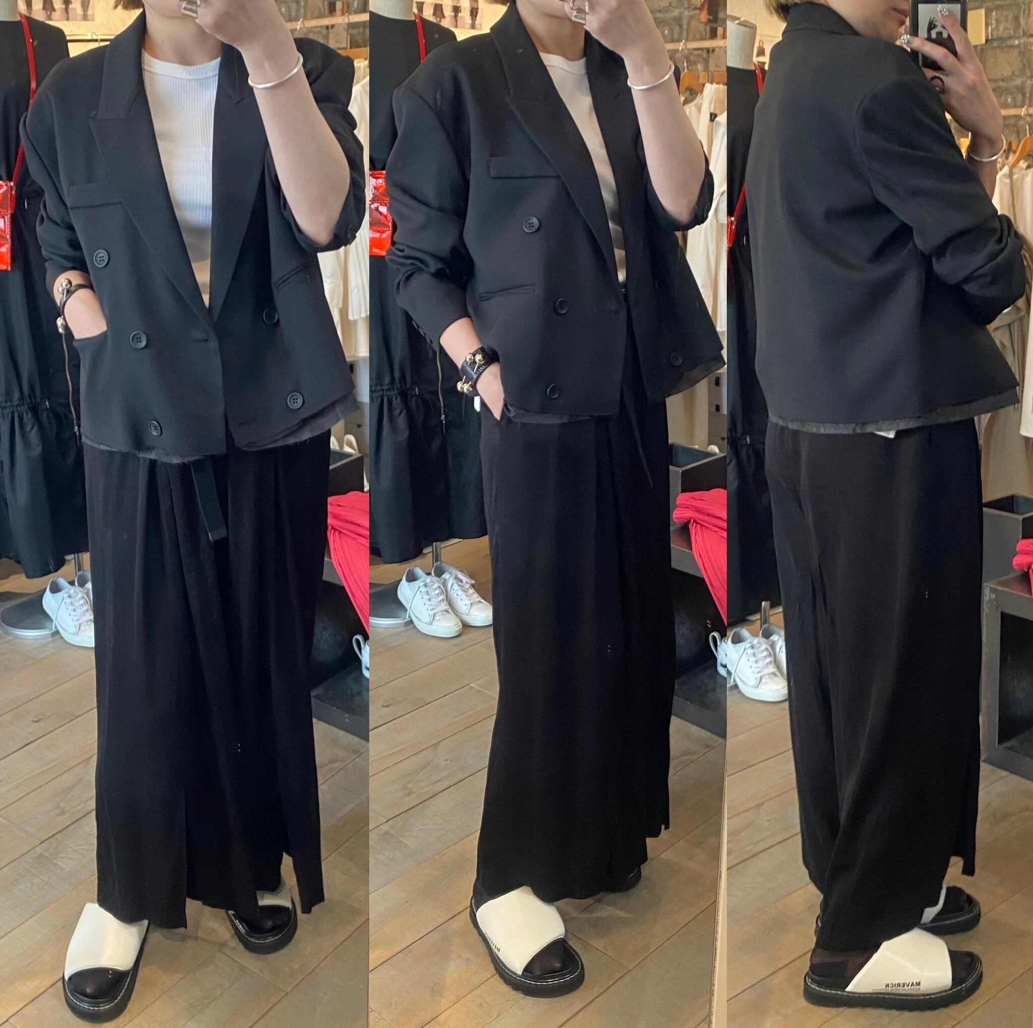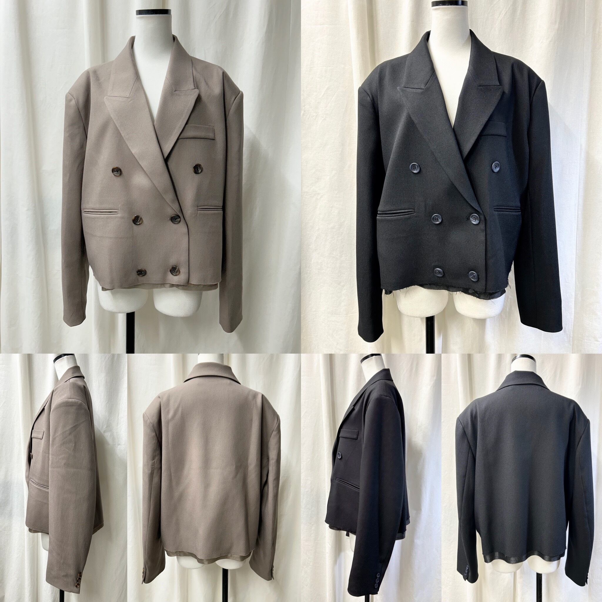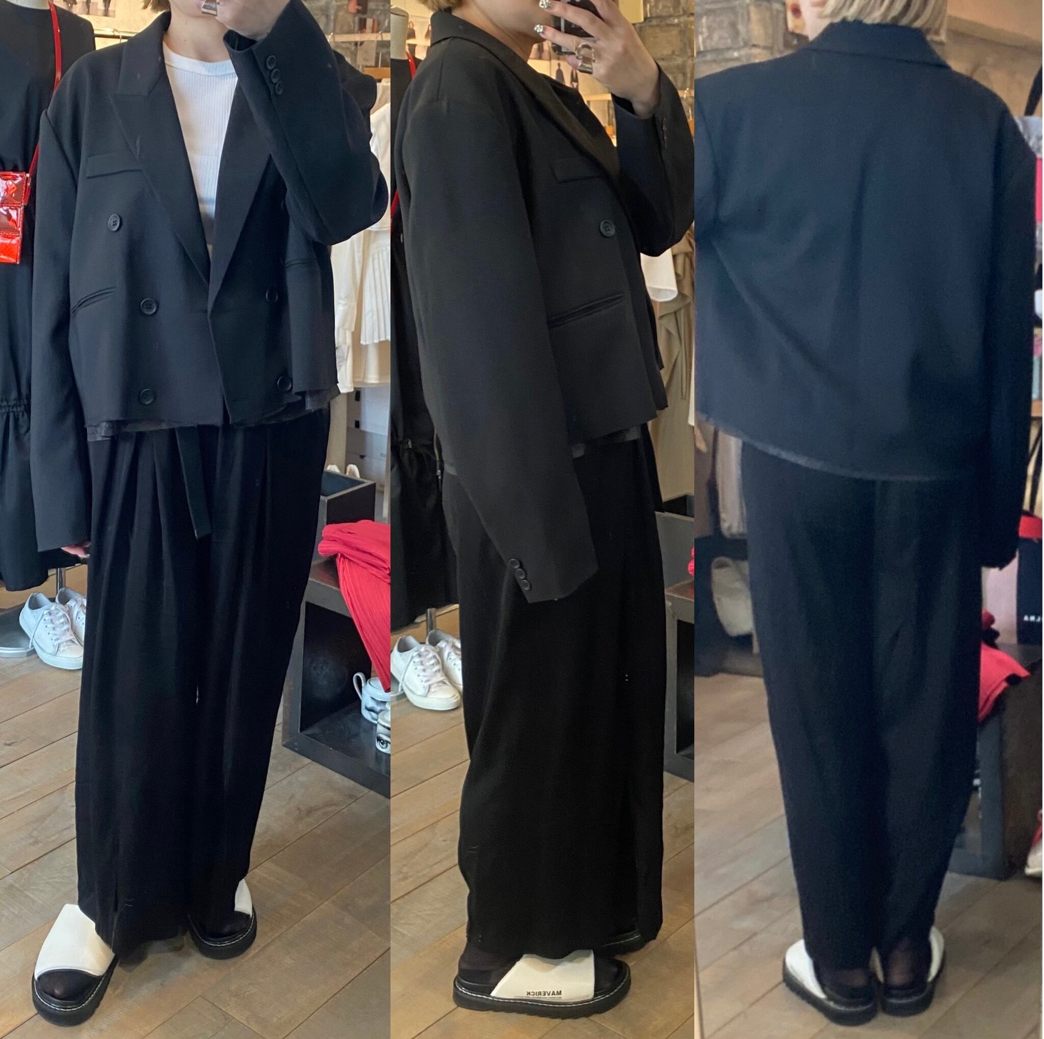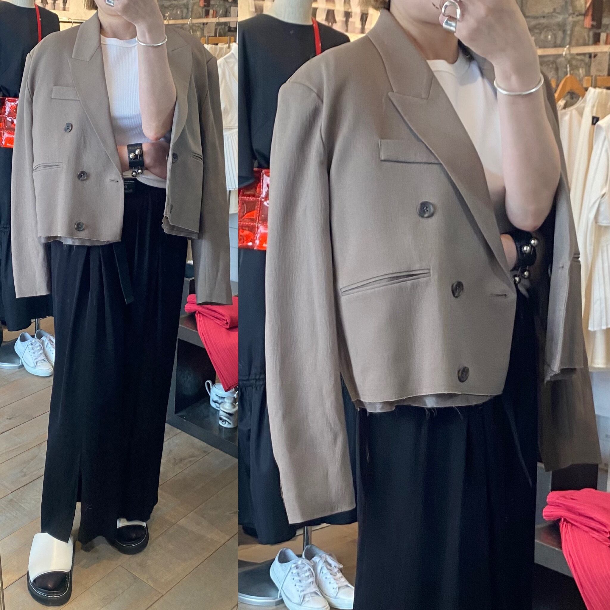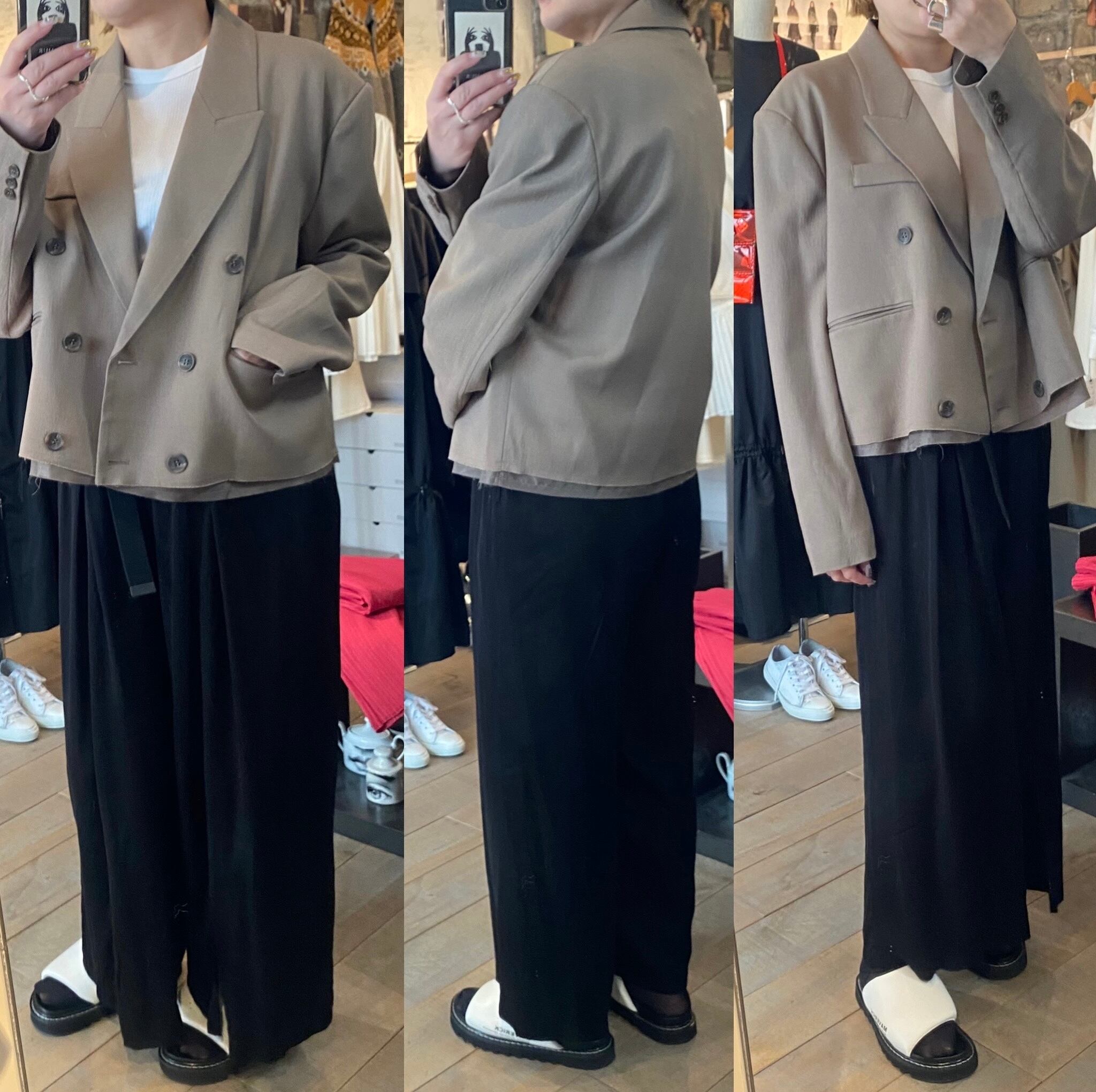ビッグサイズのジャケットをパツンと切ったようなデザインに仕上げました。肩パット入りですが張りすぎないような位置に入れています。あまりないシルエットと着丈で、スタイリングを新鮮にしてくれます。ポリエステルに伸縮性のある素材をプラスさせ、シーズンも長く着用でき、着心地も◎