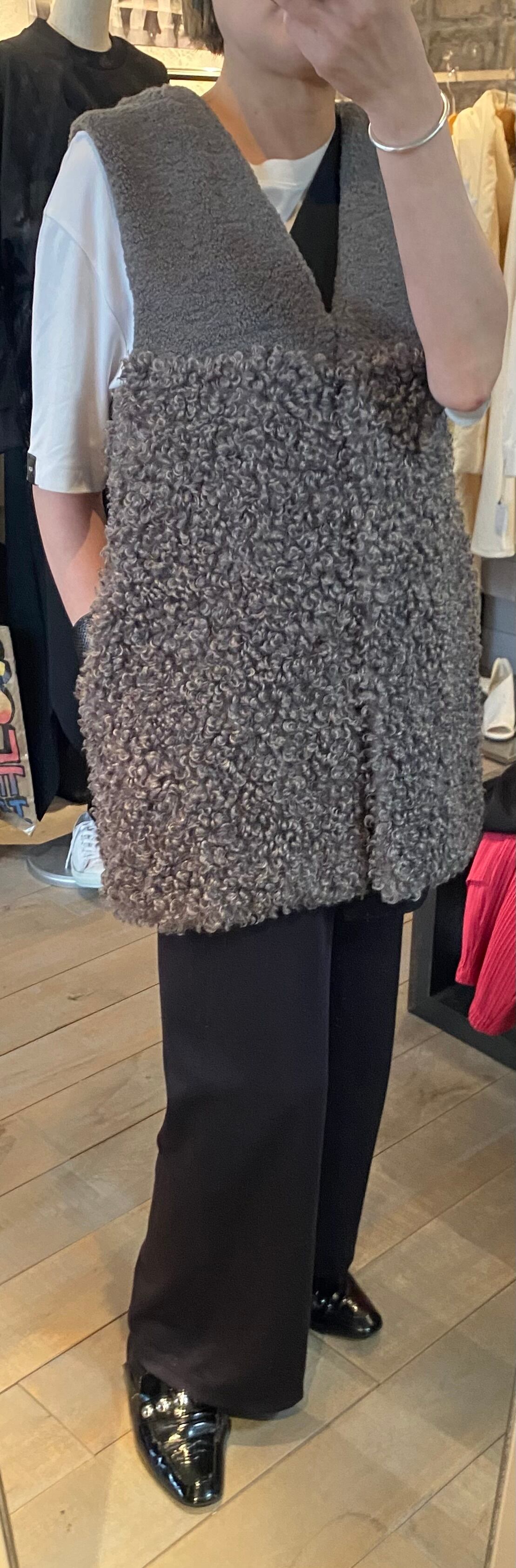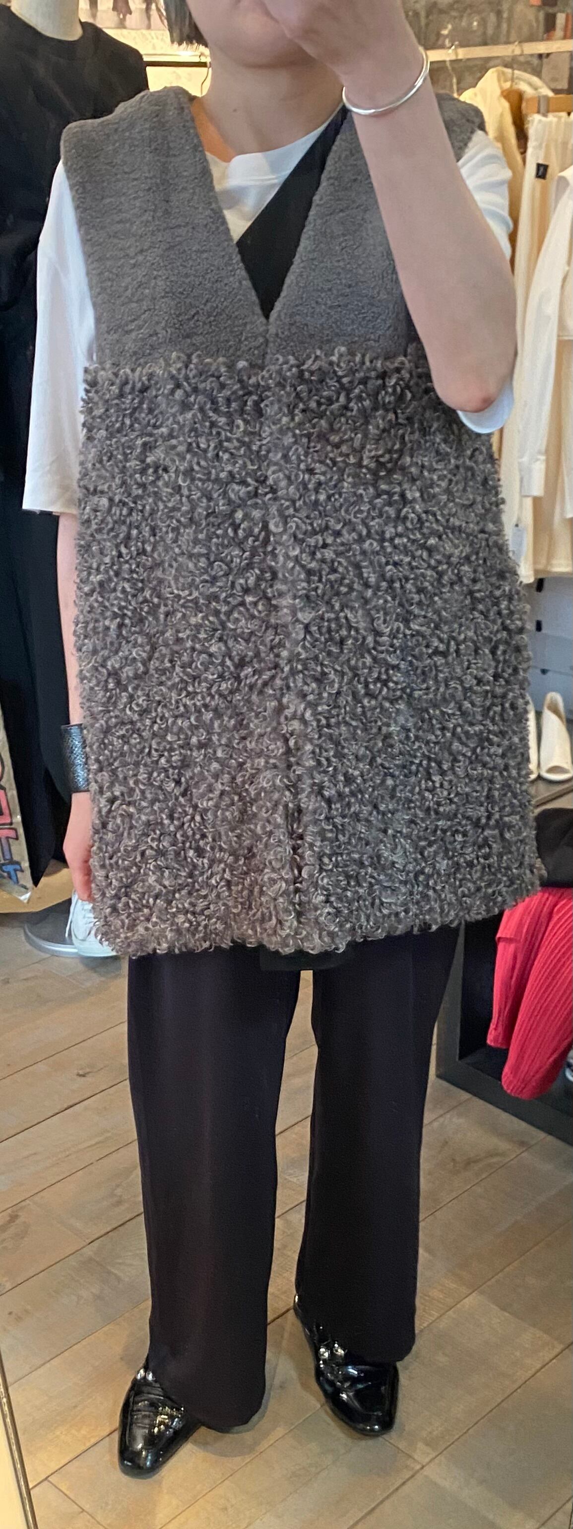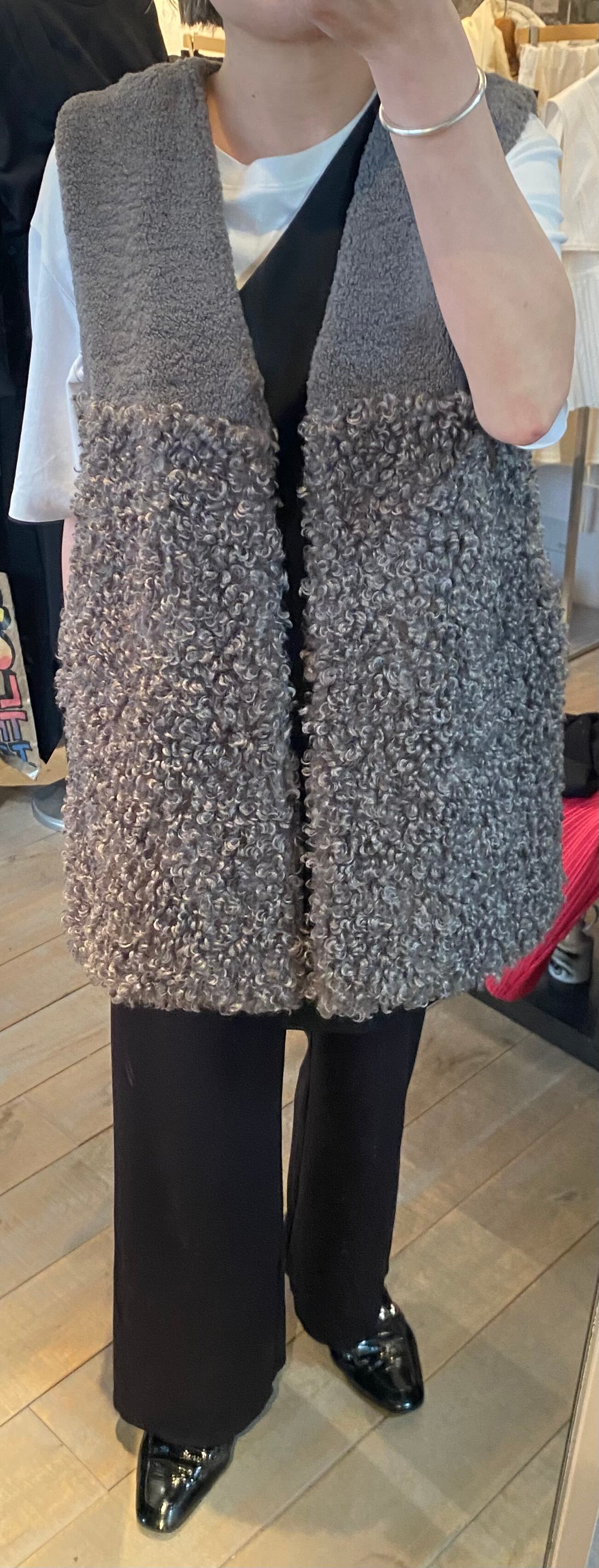 スタイリングのポイントになるボアベスト。2種類の毛足のボアを使用し、まったりならずボリューム感も程よいまとまりです。両サイドポケット有り、フロントはホックで開閉自由です♪レイヤードに活躍するアイテム☆