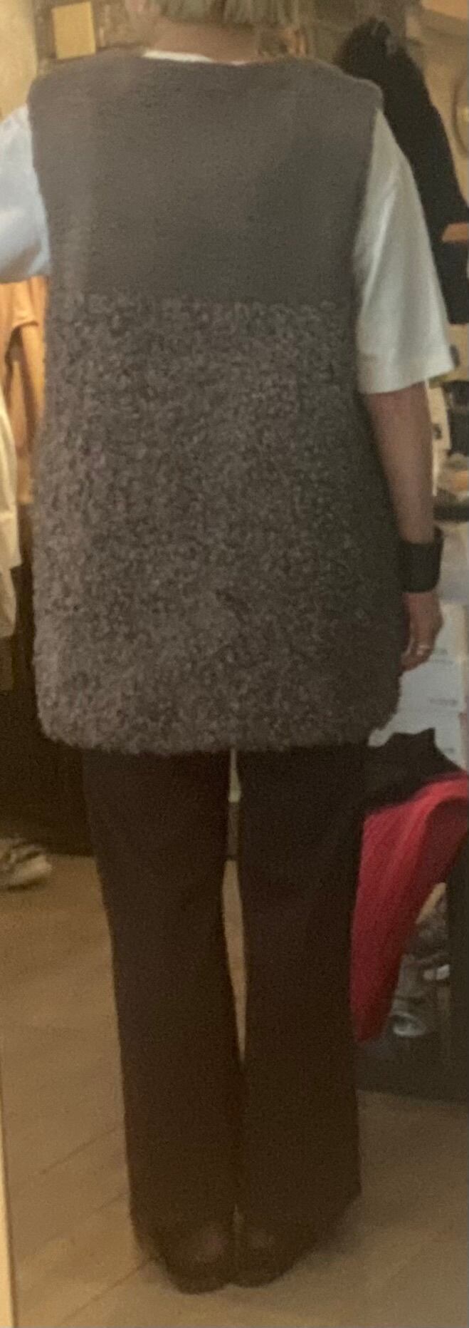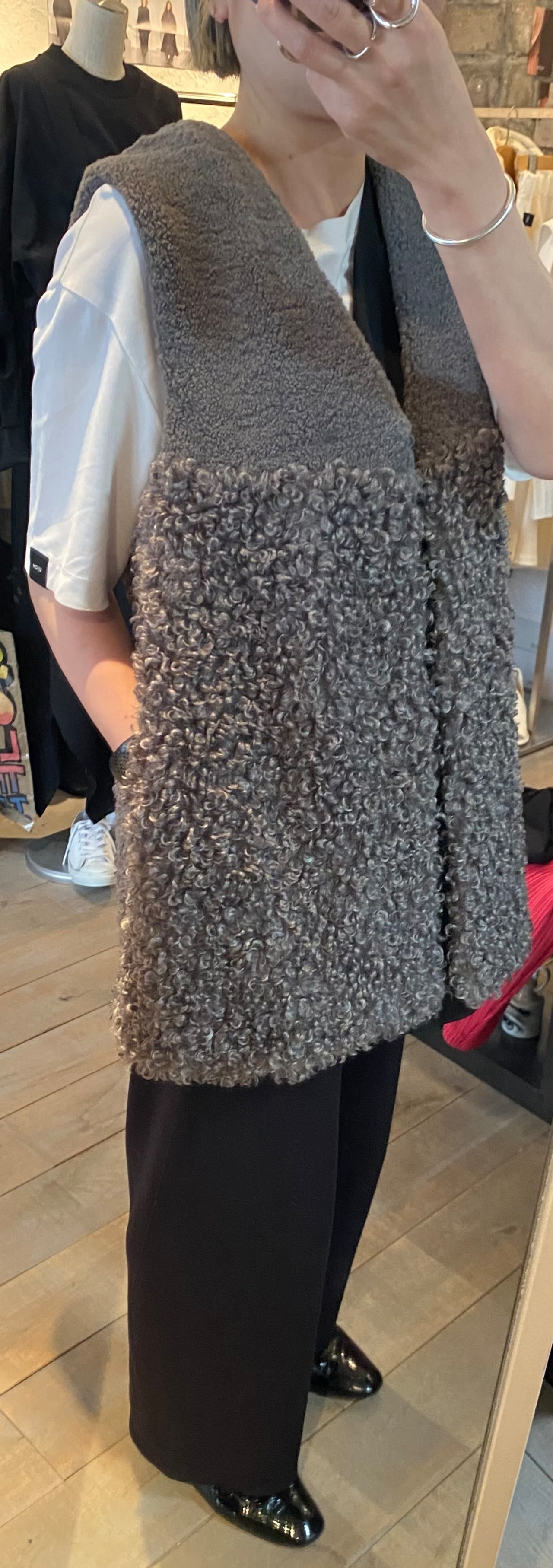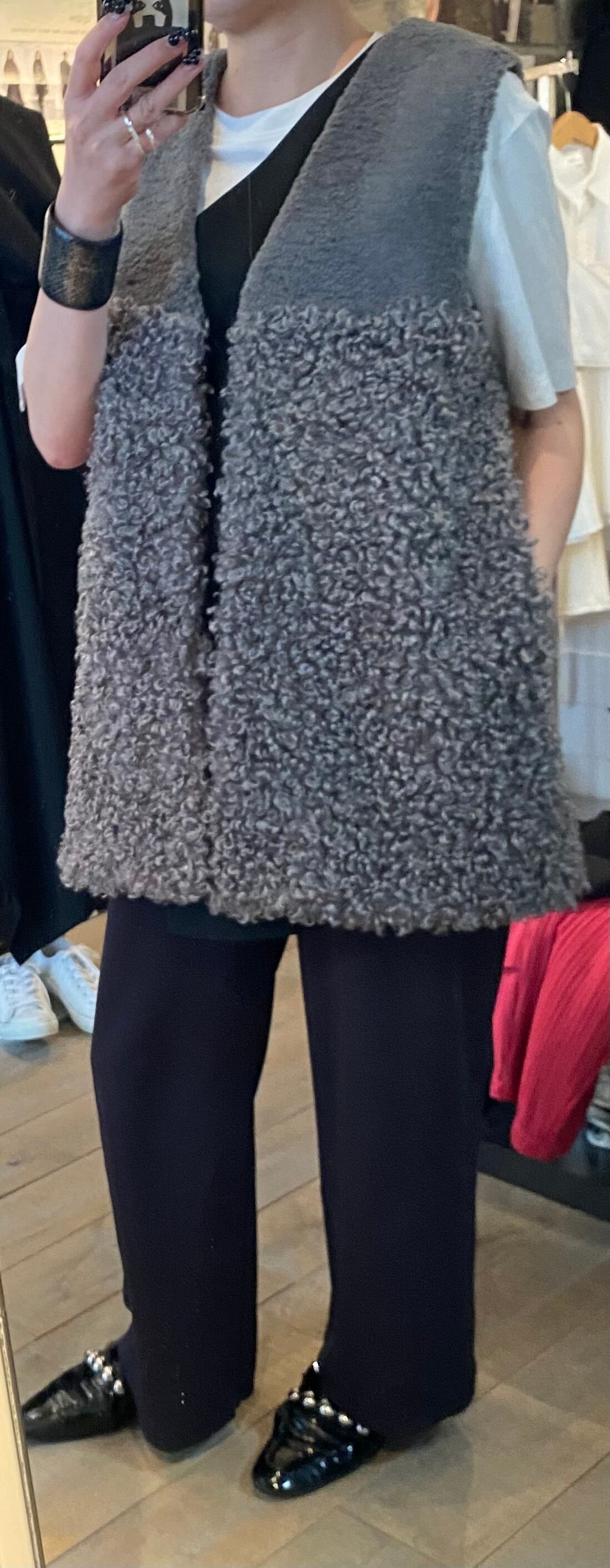 スタイリングのポイントになるボアベスト。2種類の毛足のボアを使用し、まったりならずボリューム感も程よいまとまりです。両サイドポケット有り、フロントはホックで開閉自由です♪レイヤードに活躍するアイテム☆