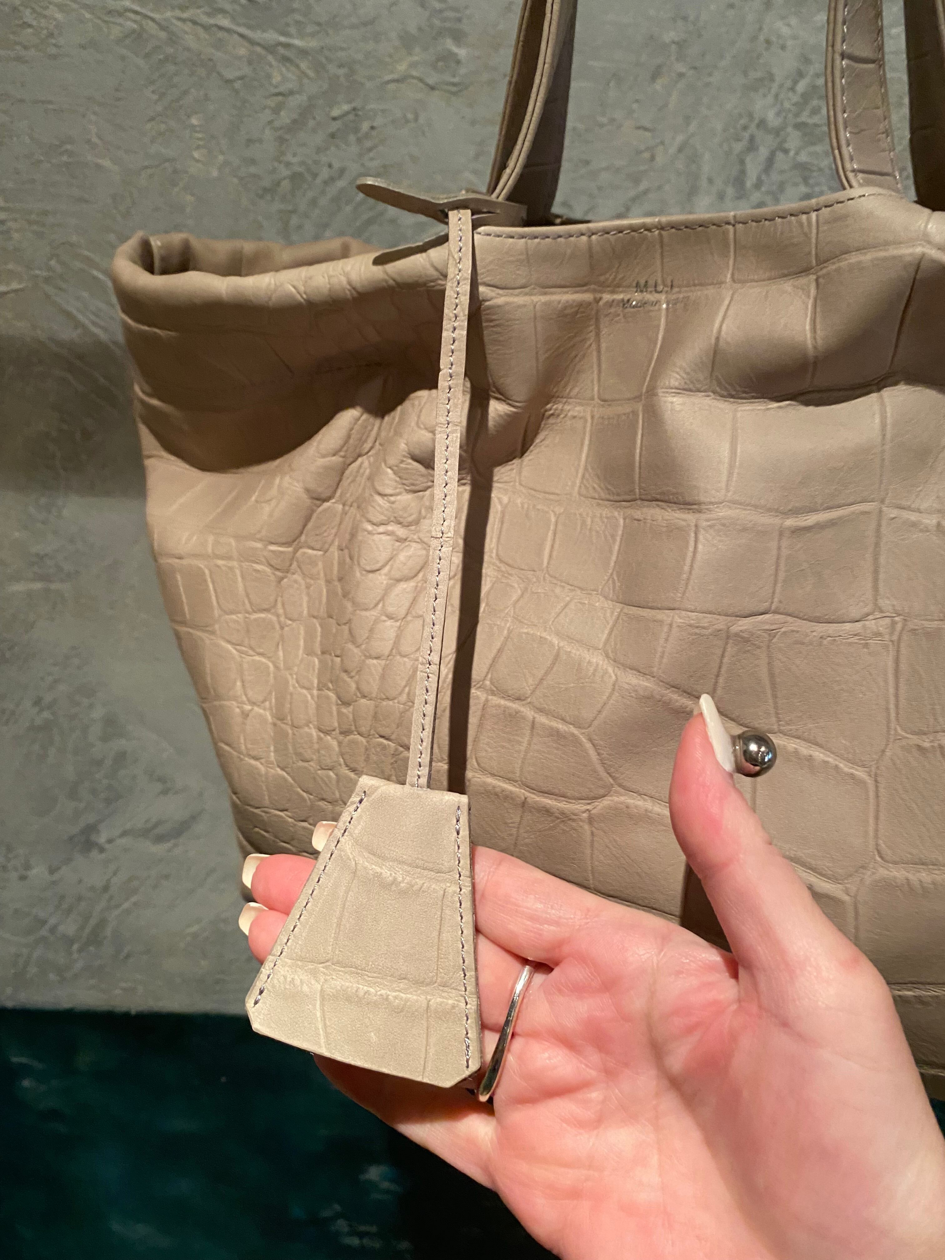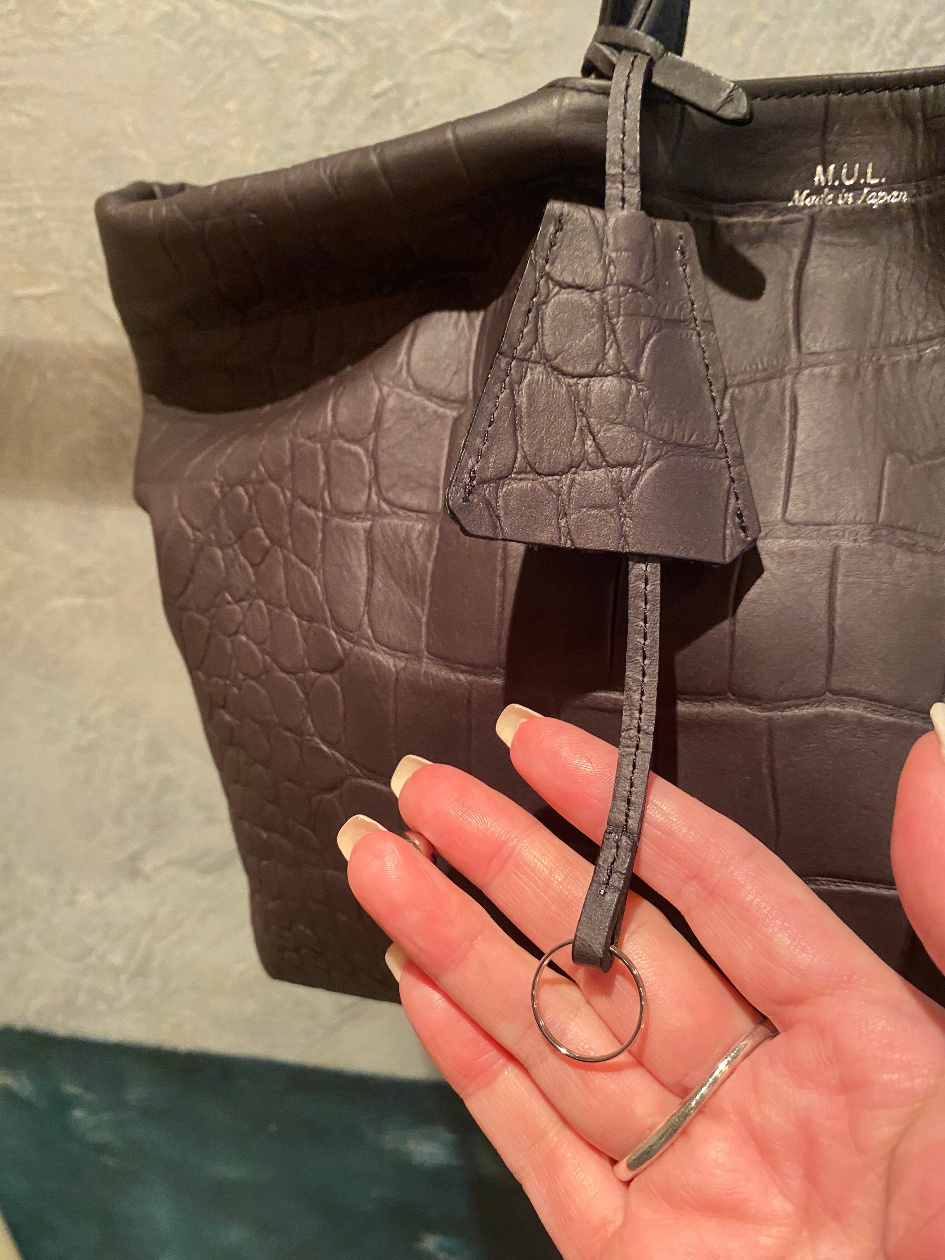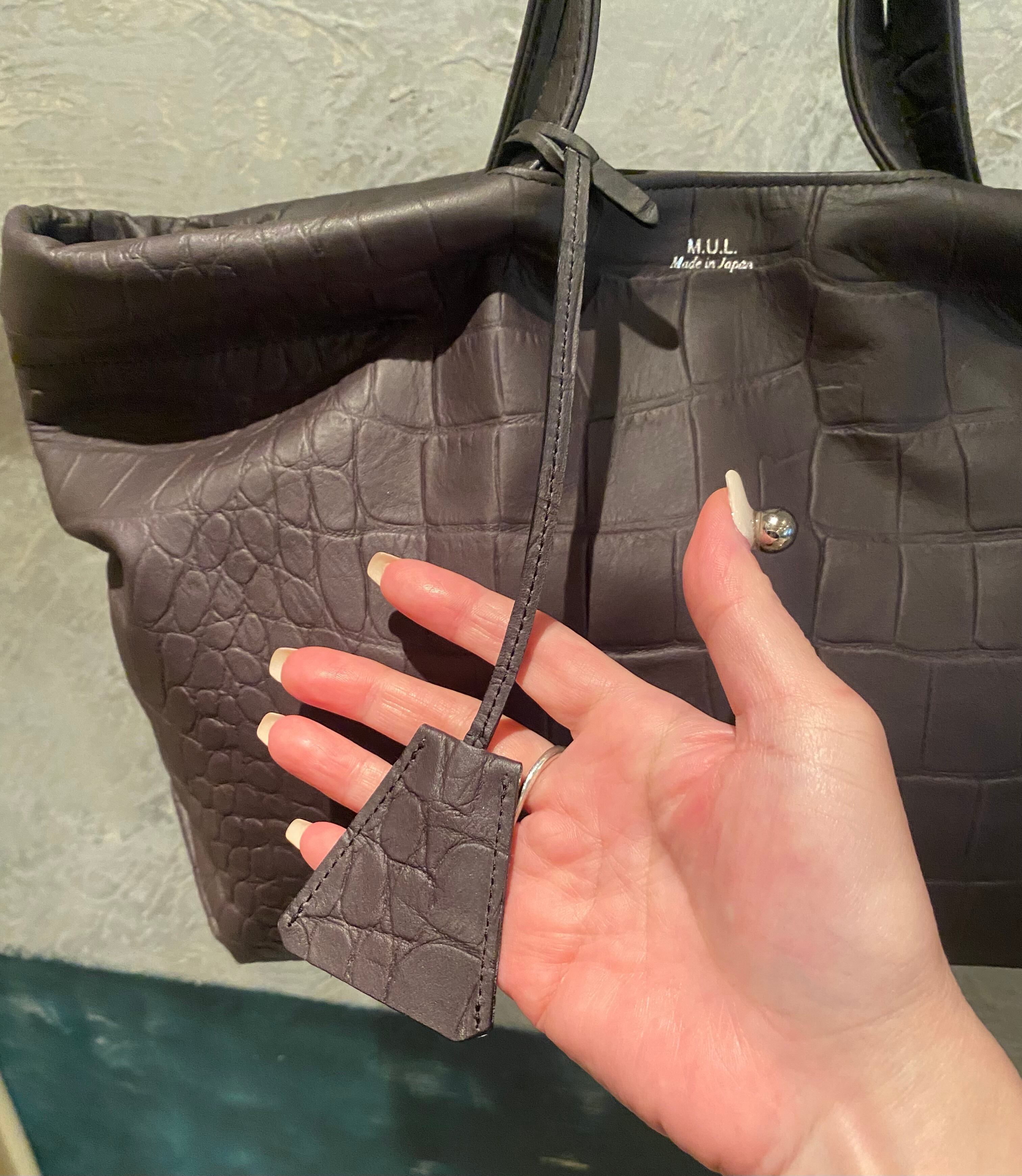 ソフトダメージオイルレザーを使用したBENT TOTE BAG。いずれも鍵などをつけて頂けるキーホルダー付き。シンプルながらハンドル部分のデザインにこだわりがあり、ハンドル部分を絞って頂くとハンドル長さが少々調節してもらえます。内側にファスナー付きポケット1つ、ファスナー無しポケット2つあり。外側にファスナー付きポケット1箇所。金具があまりついてないシリーズなので大容量ですが軽量なのも嬉しいところ。