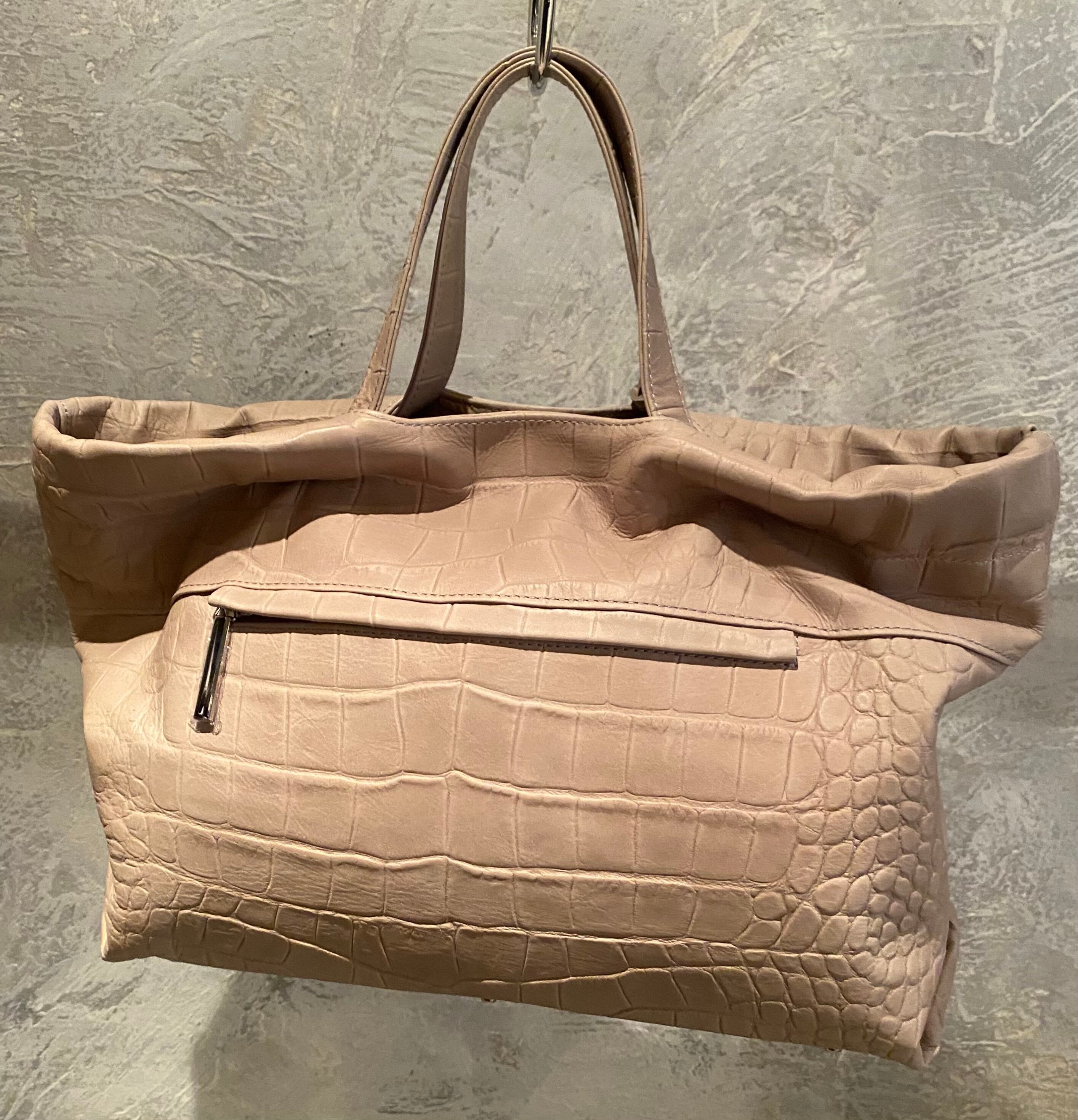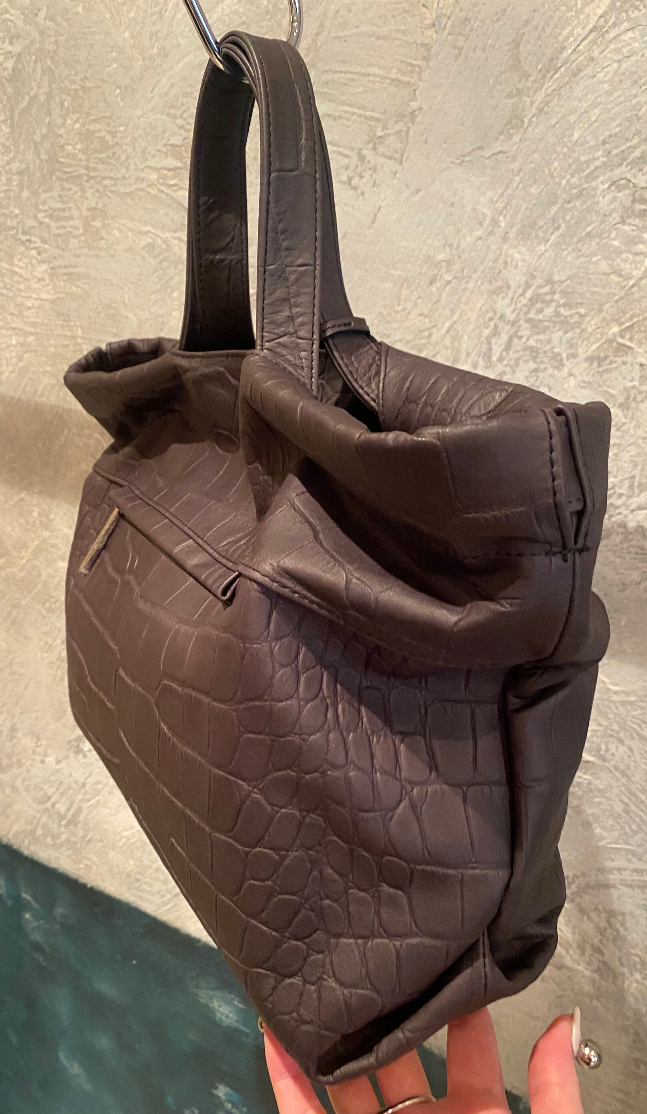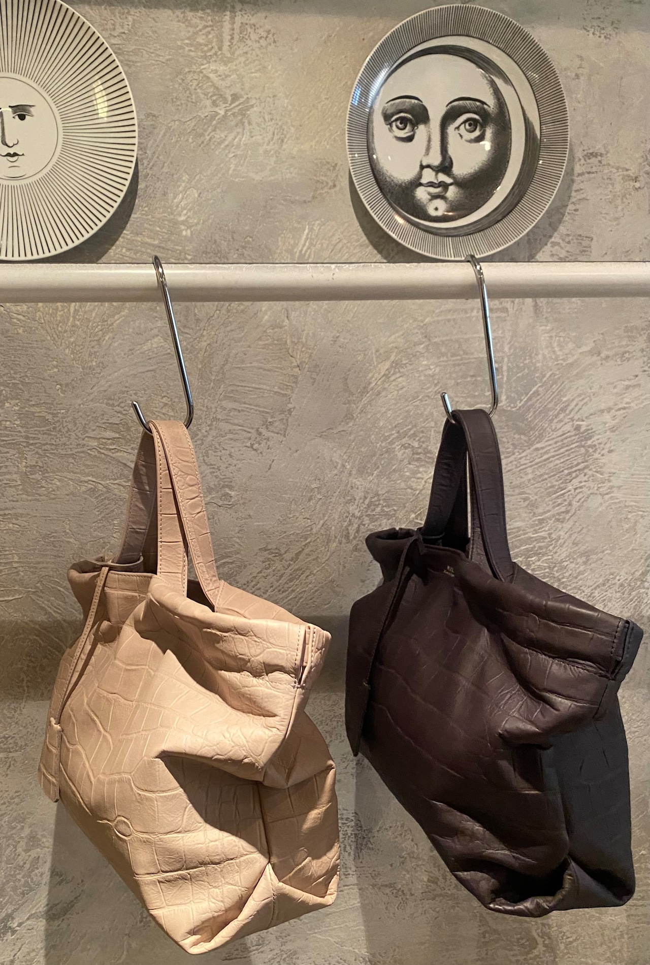 ソフトダメージオイルレザーを使用したBENT TOTE BAG。いずれも鍵などをつけて頂けるキーホルダー付き。シンプルながらハンドル部分のデザインにこだわりがあり、ハンドル部分を絞って頂くとハンドル長さが少々調節してもらえます。内側にファスナー付きポケット1つ、ファスナー無しポケット2つあり。外側にファスナー付きポケット1箇所。金具があまりついてないシリーズなので大容量ですが軽量なのも嬉しいところ。