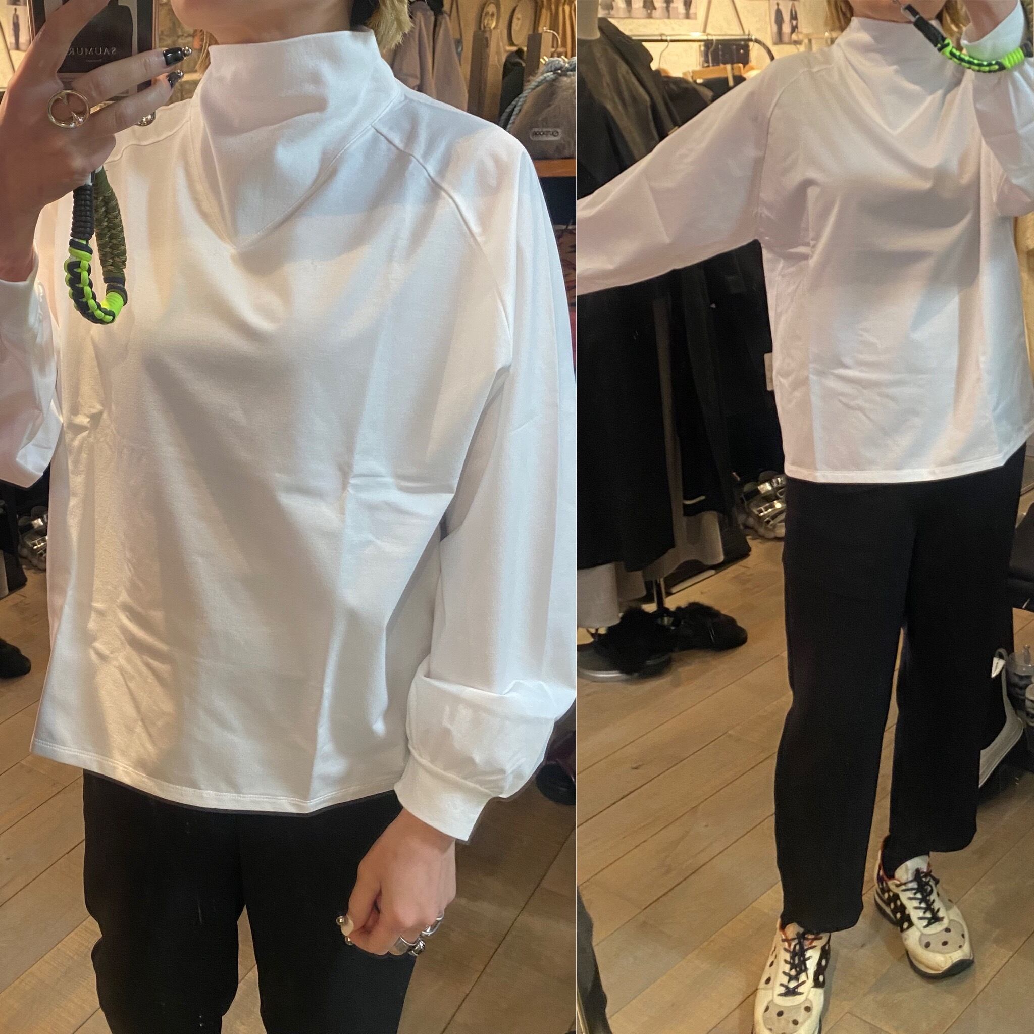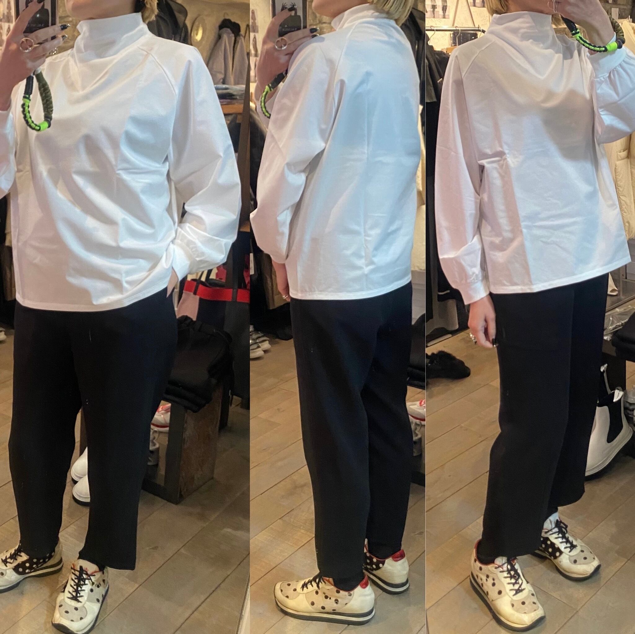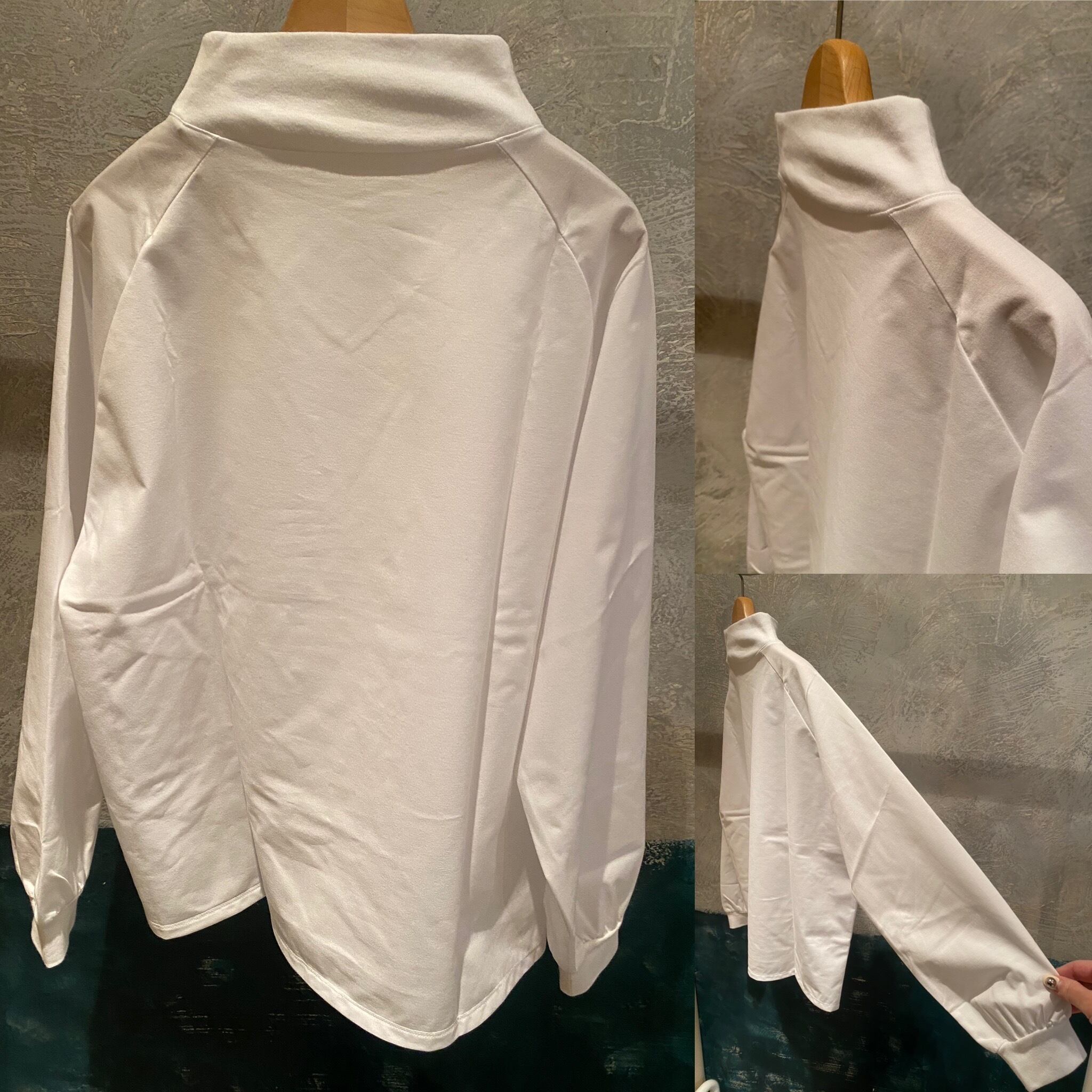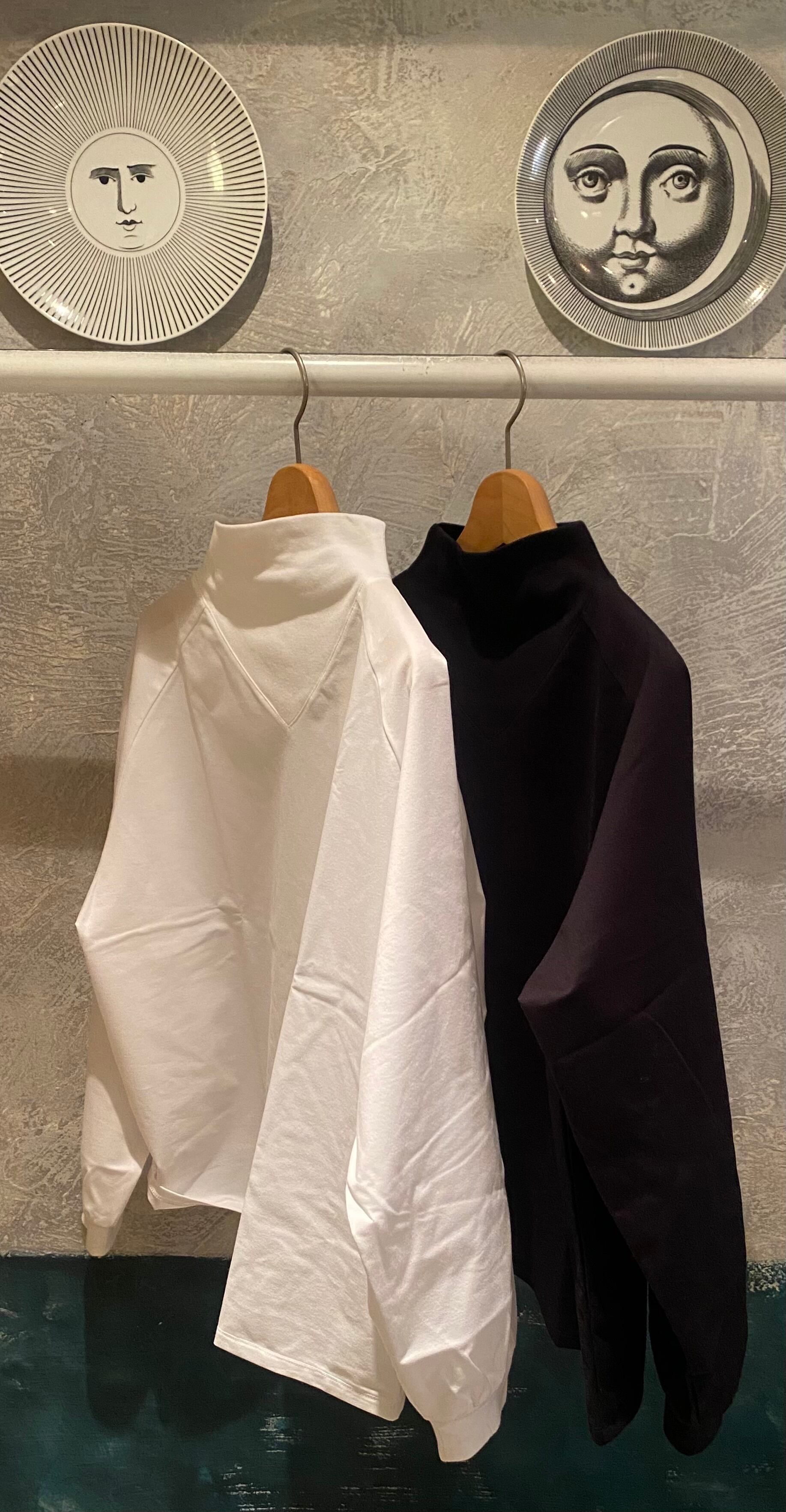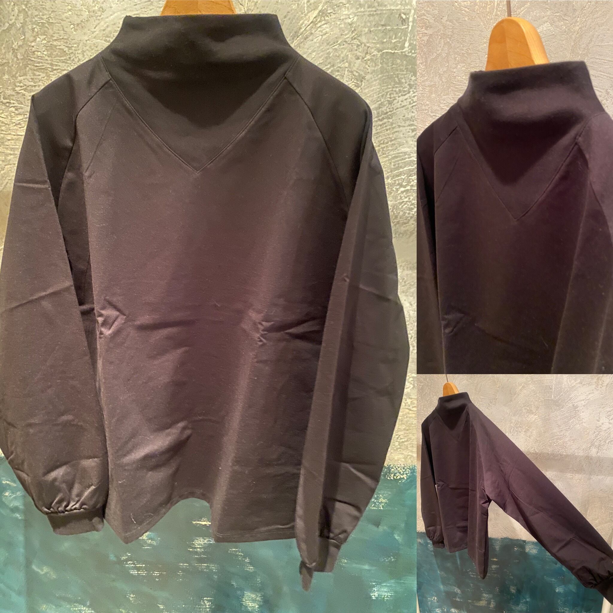 ハイネック× Vネックがポイントのスポーツライクなトップス。ネック部分は柔らかいフライスで、Vのデザインポイントが首元をスッキリ見せてくれるため、ハイネックが苦手な方でも抵抗なく、快適に着用して頂けます。44Gというハイゲージで編み立て、更に特殊な加工でハリ感と膨らみを追加した新しいニットシャツです。