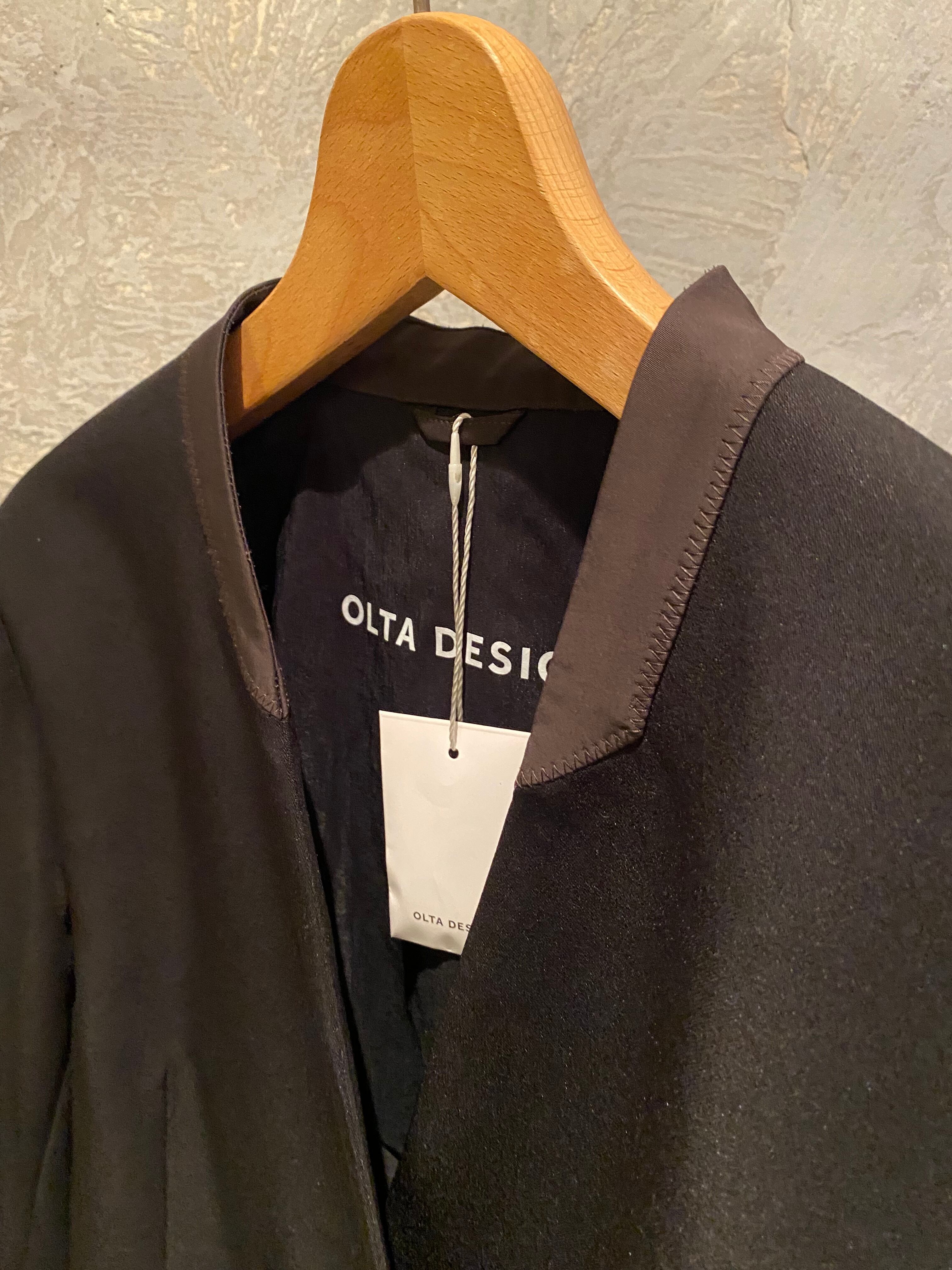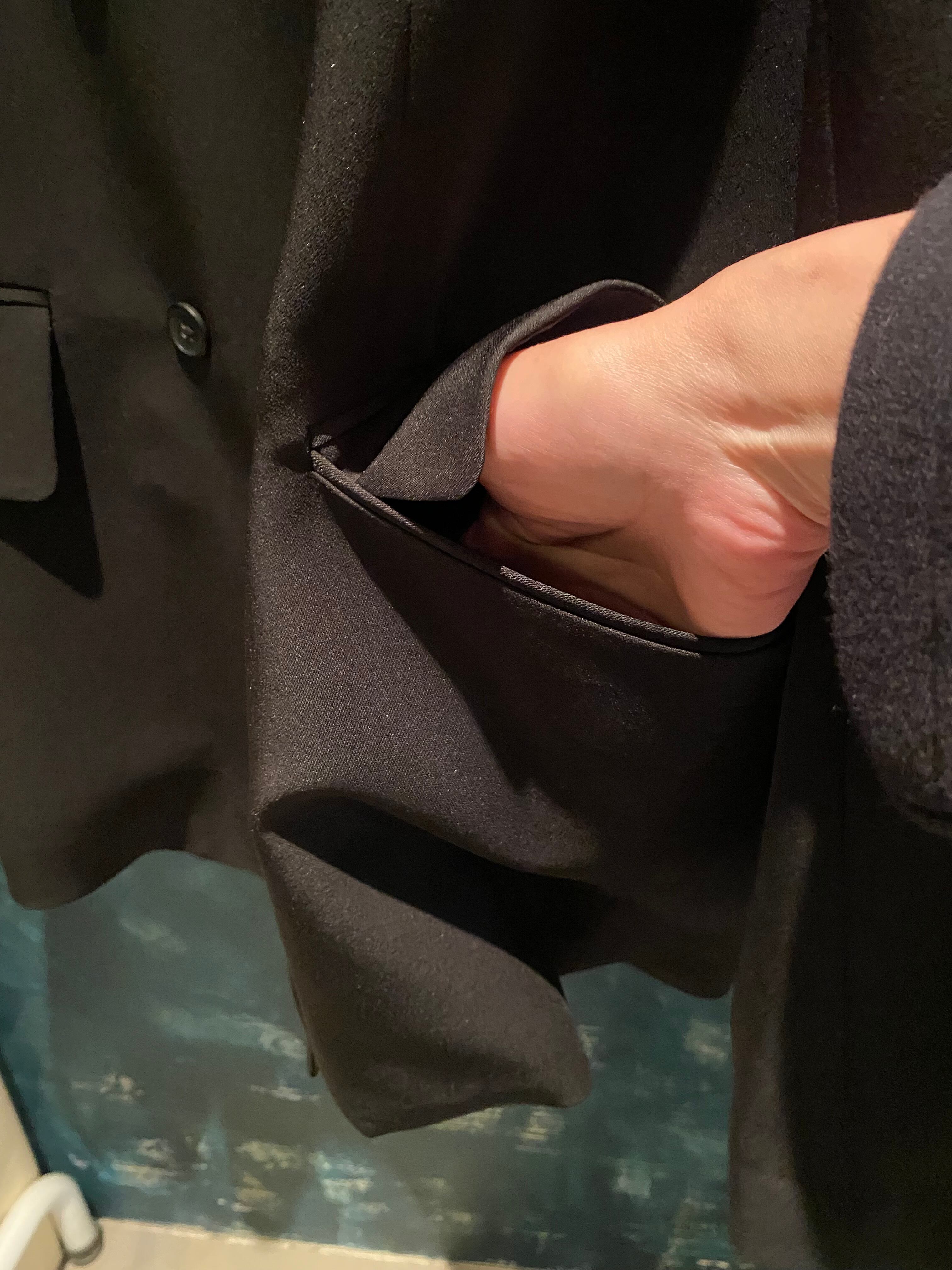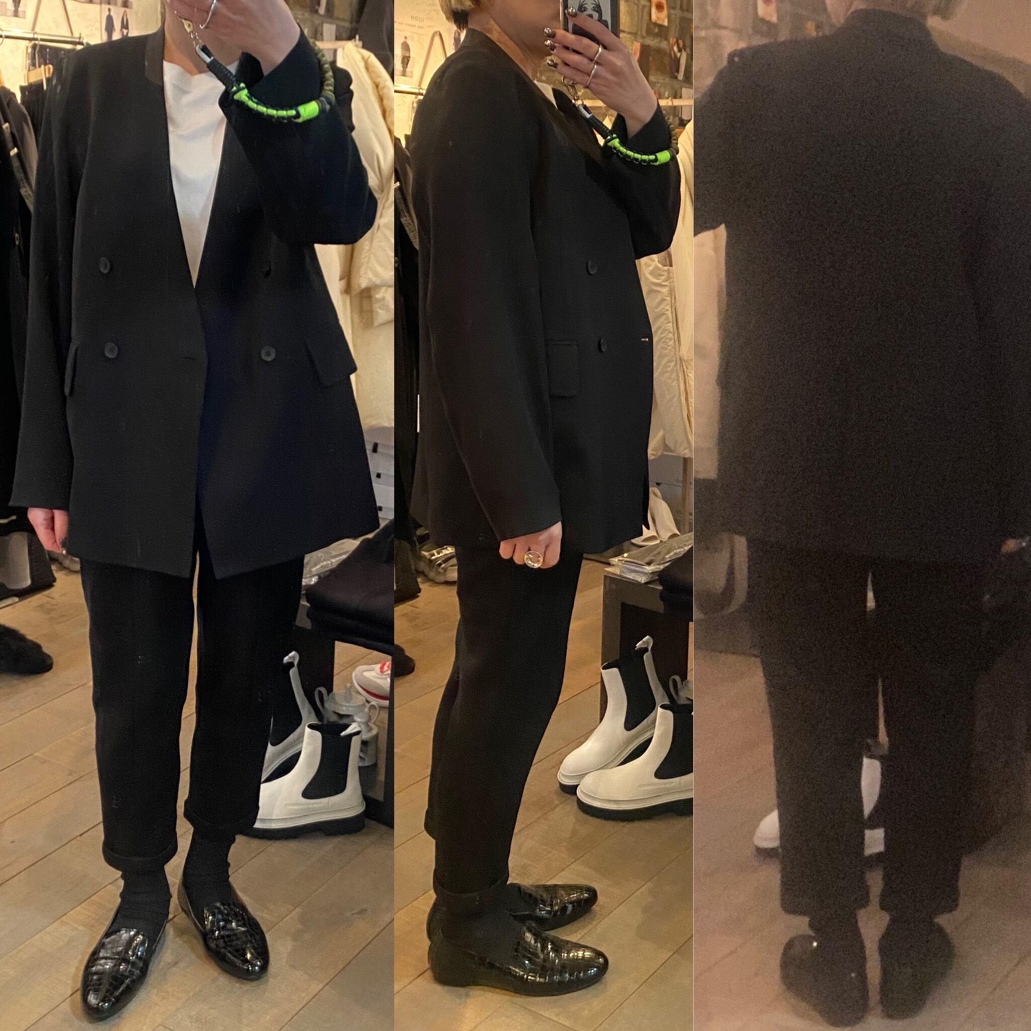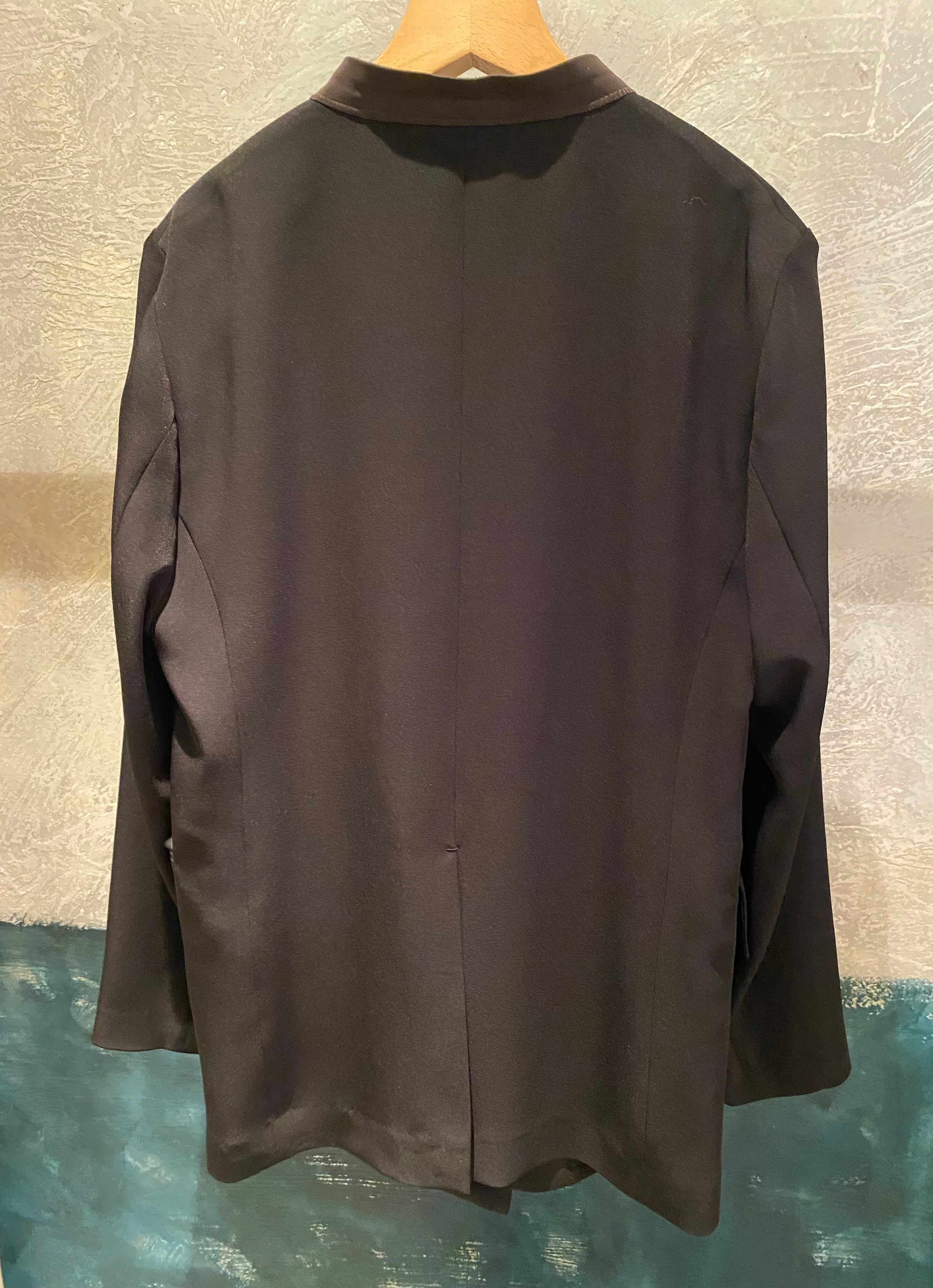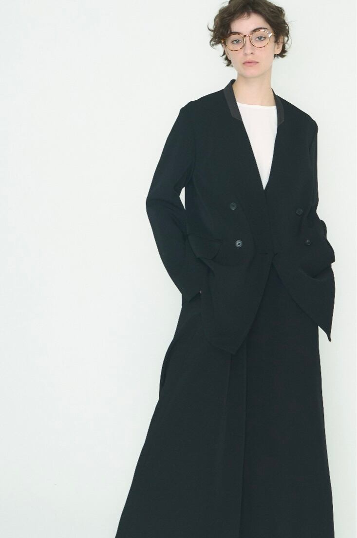 本格的なテーラリング技術を駆使して仕立てたカラーレスジャケット。カラークロスを彷彿とさせる衿の千鳥ミシン仕様や、肩パッドを使用せずに、肩増芯を使う事で肩からバストのラインを美しく見せることができます。高温化する気候対策として、ウール代替素材用に開発された梳毛調合繊にレーヨンを合撚することで柔らかい表情にしたラチネ素材を使用。