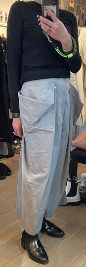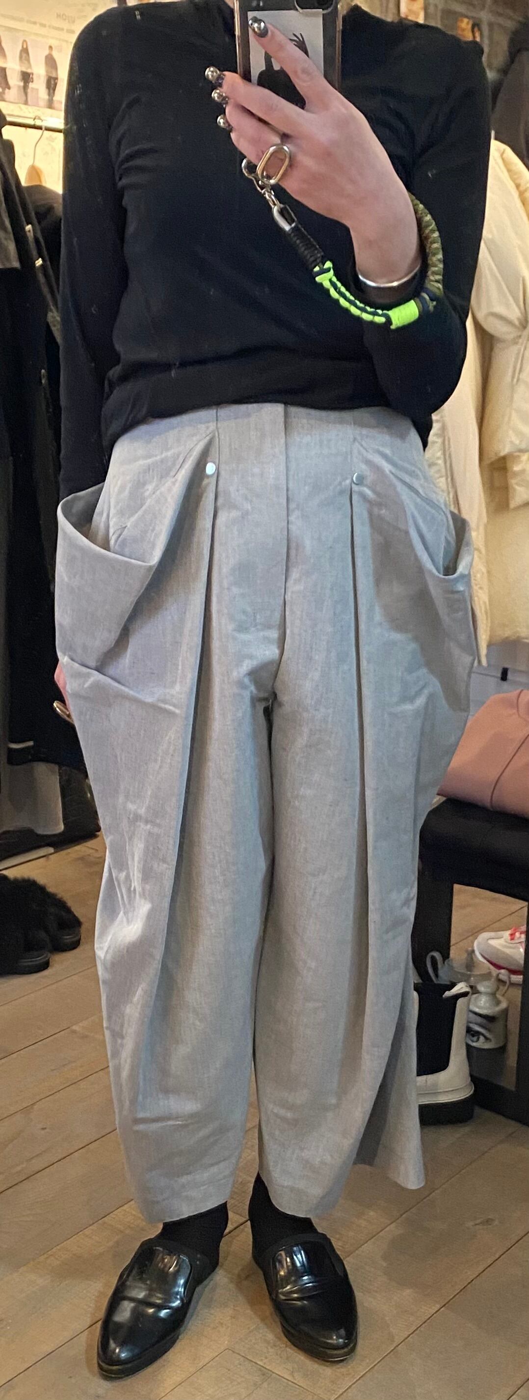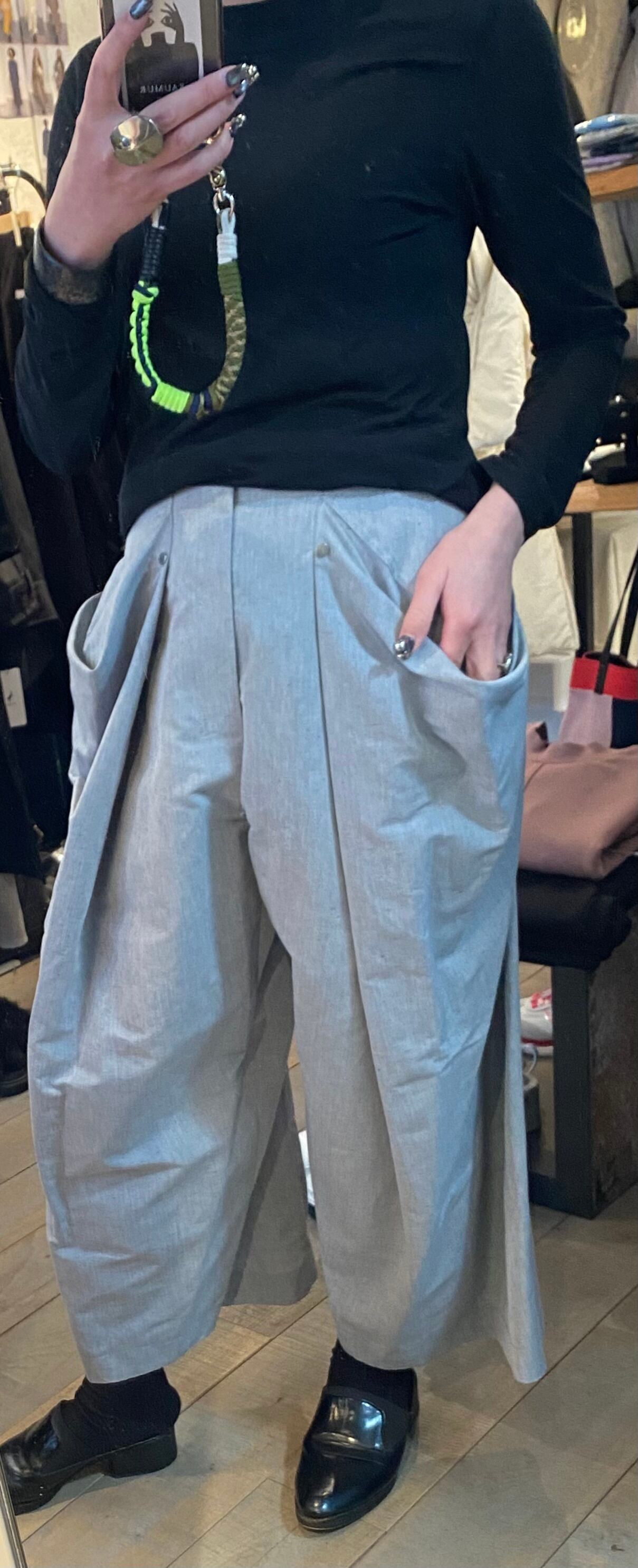 ユニークなフレアが際立つデザインのパンツ。サイドに広がるボリュームが、動きと立体感を強調し、モダンで個性的なシルエットを作り出します。少しハイウエスト仕様でウエスト部分はスッキリとしたラインを保ちながら、スタイル全体を引き締めます。
