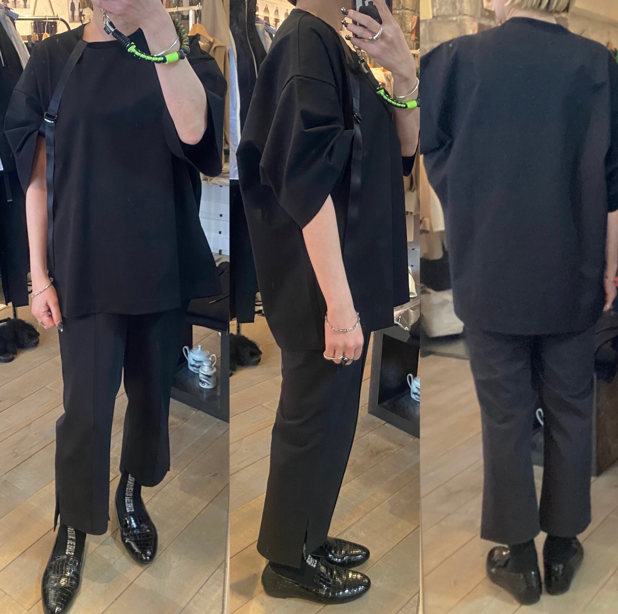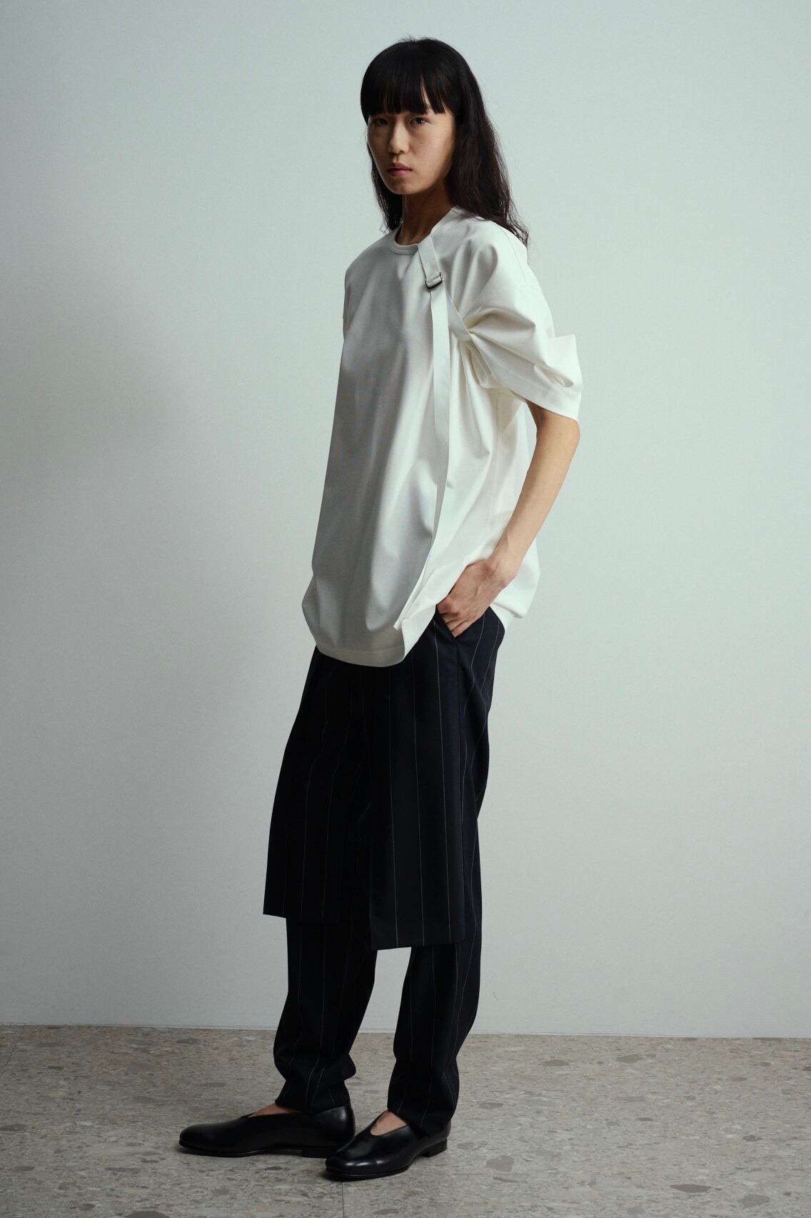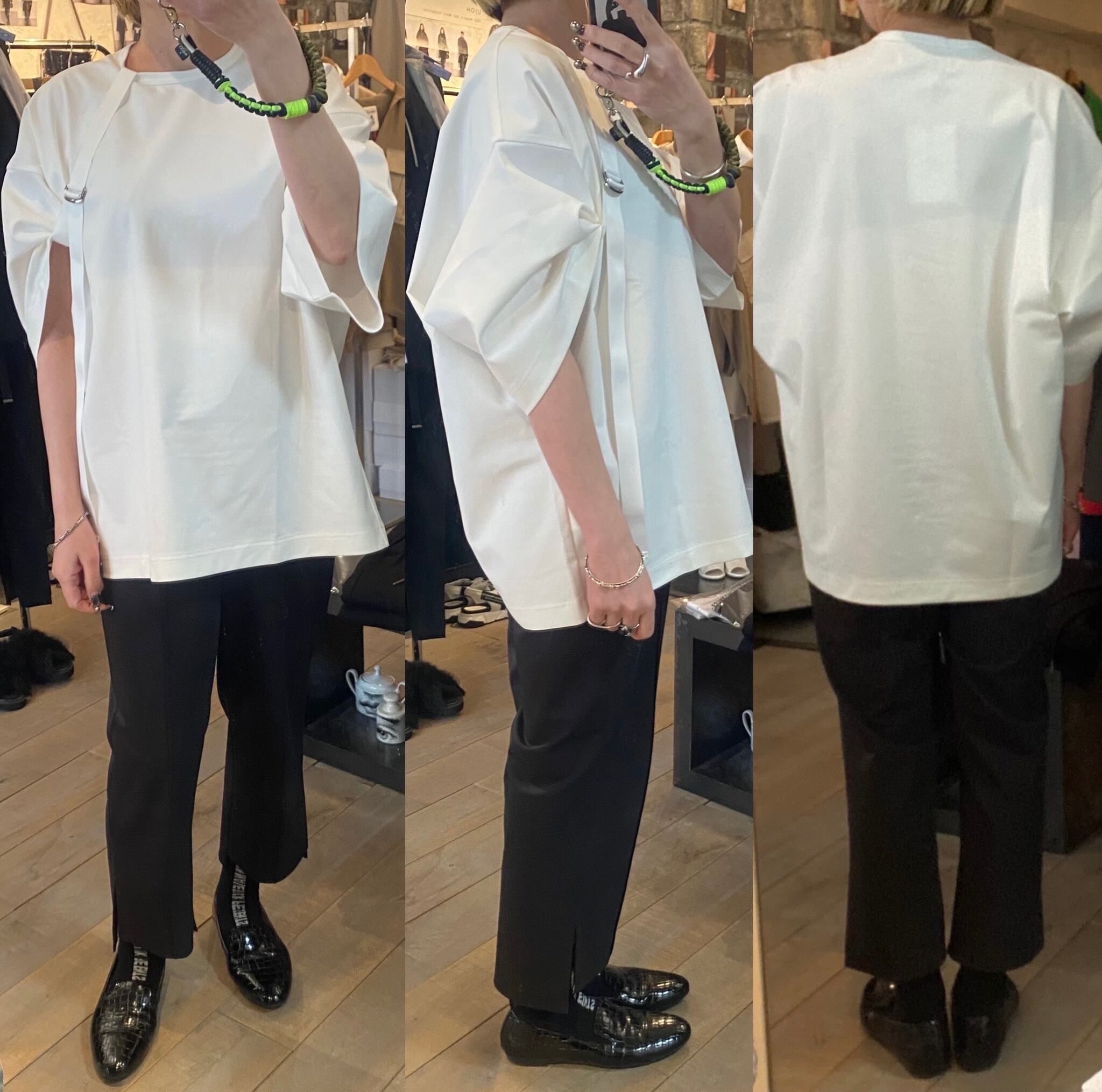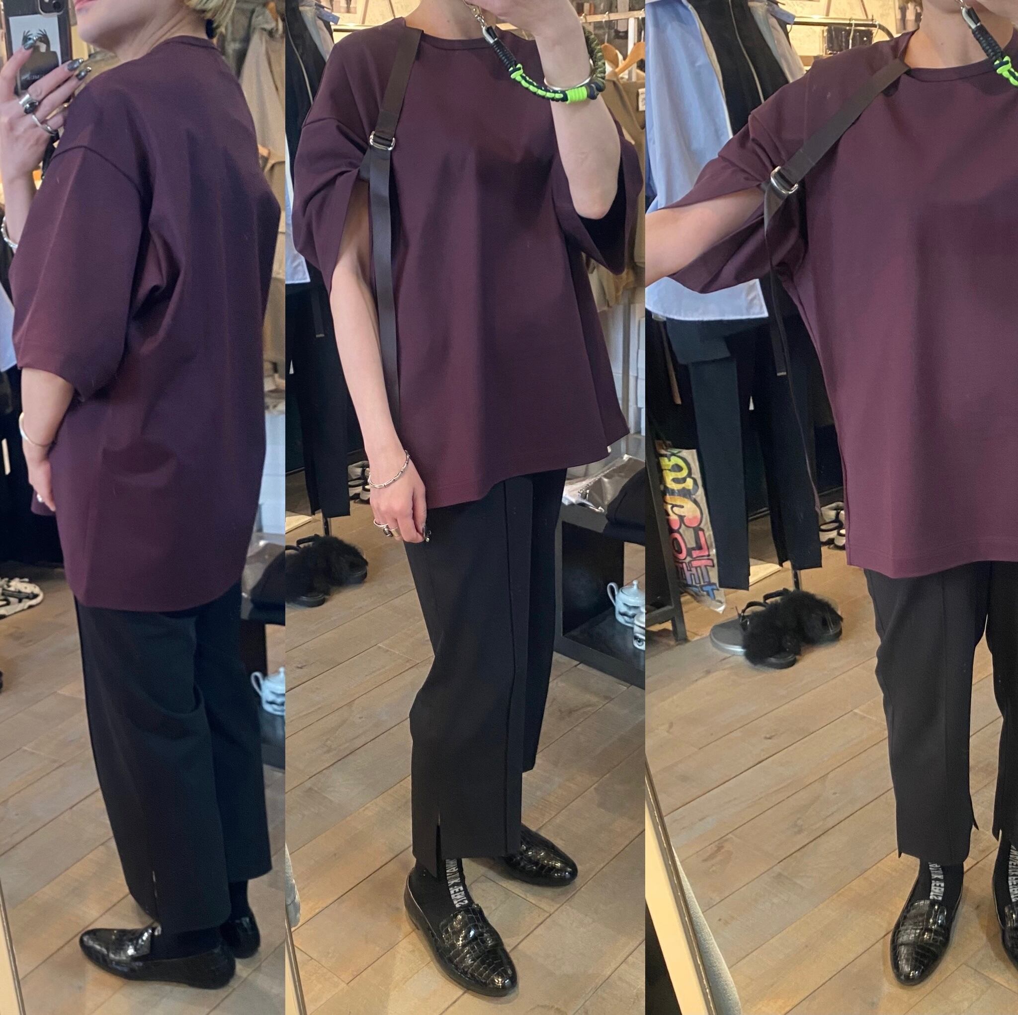 スーピマコットン100%を使用し、高密度に編み立てた素材です。高密度に編み込む事で生地にハリ、コシを持たせ、加工により強撚のようなシャリ感も感じる仕上がりの生地です。テープベルトで袖にシルエットの変化をつけたカットソーです。取り外し可能なベルトで、外すとベーシックなカットソーとしても着用できる2way仕様。