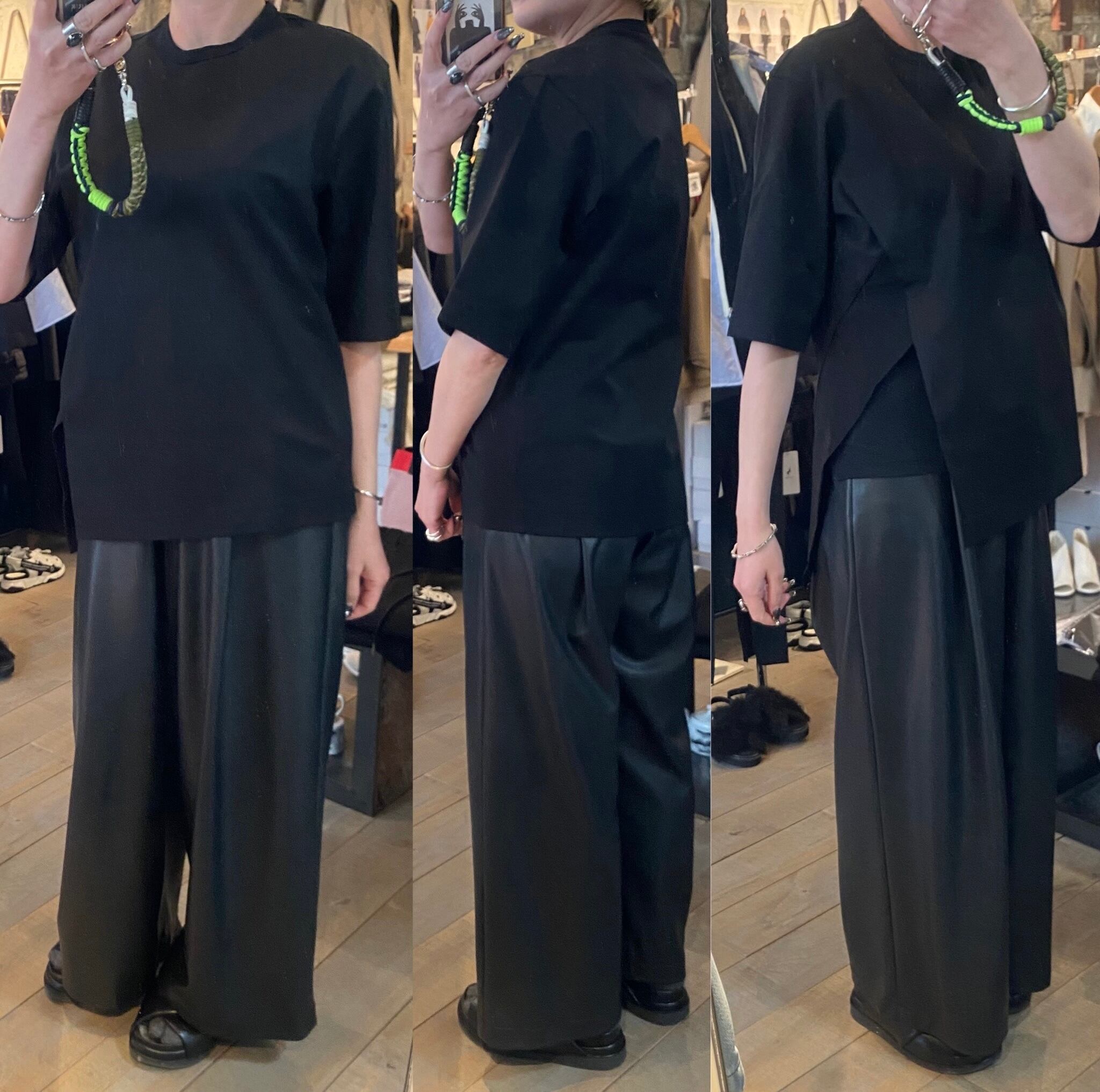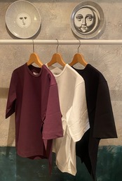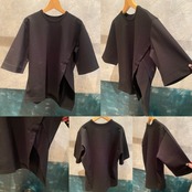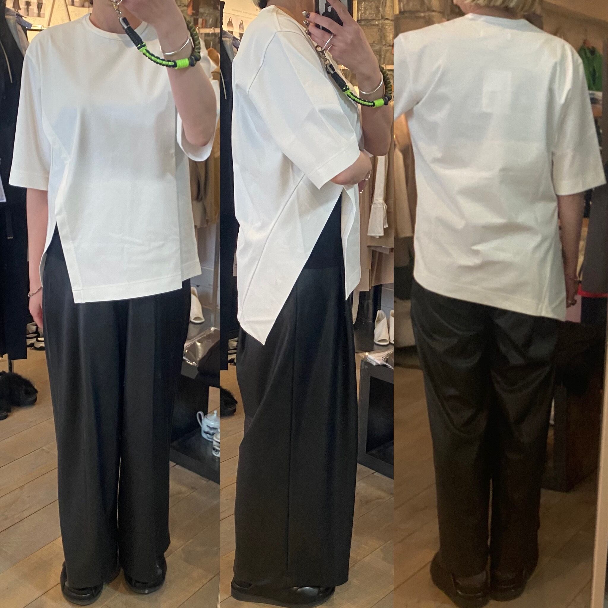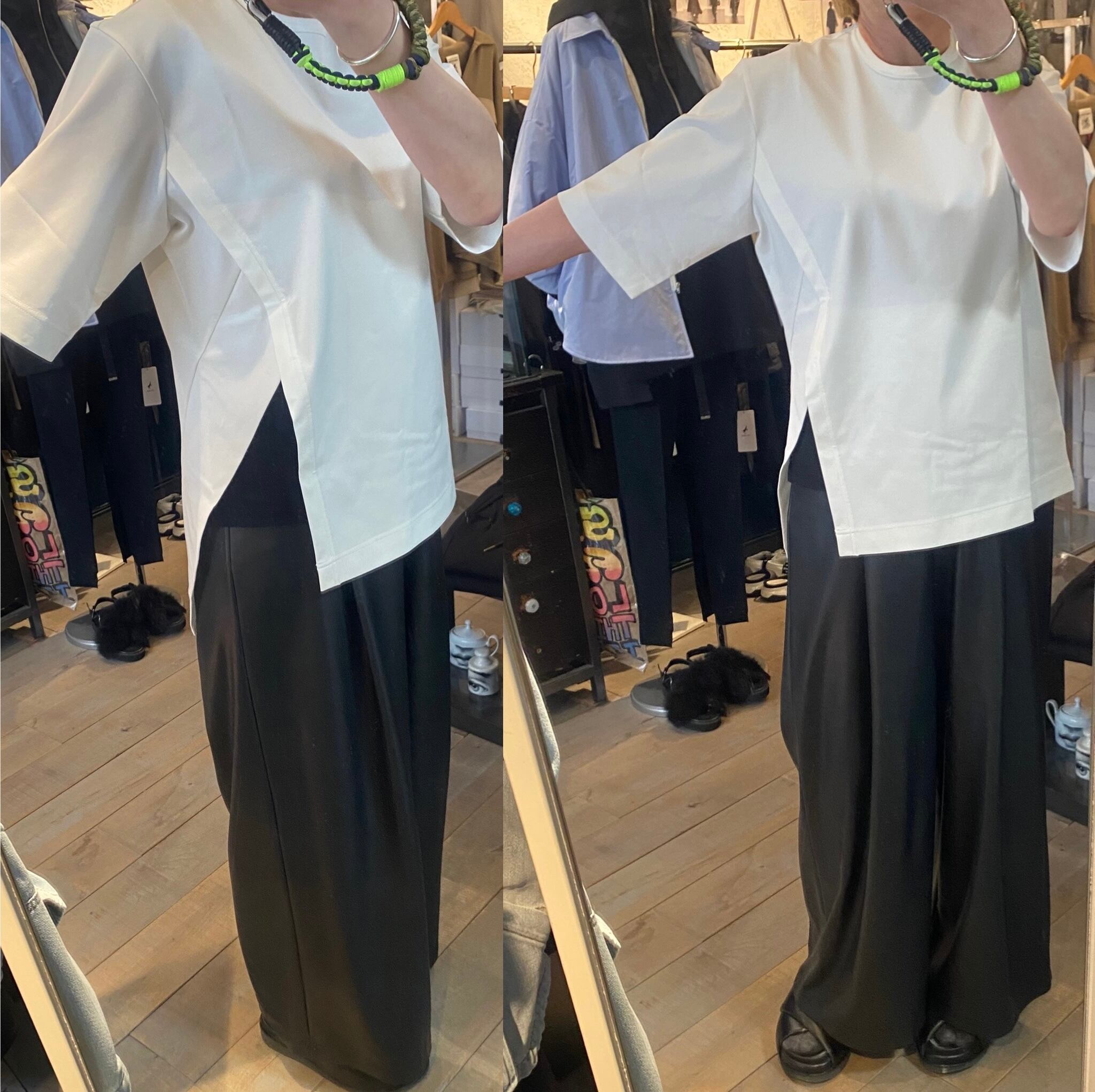 スーピマコットン100%を使用し、高密度に編み立てた素材です。高密度に編み込む事で生地にハリ、コシを持たせ、加工により強撚のようなシャリ感も感じる仕上がりの生地です。独特なラインでカッティングされた左脇のスリットが特徴的なカットソー。傾斜のついた裾と切替布がアクセントになっています。