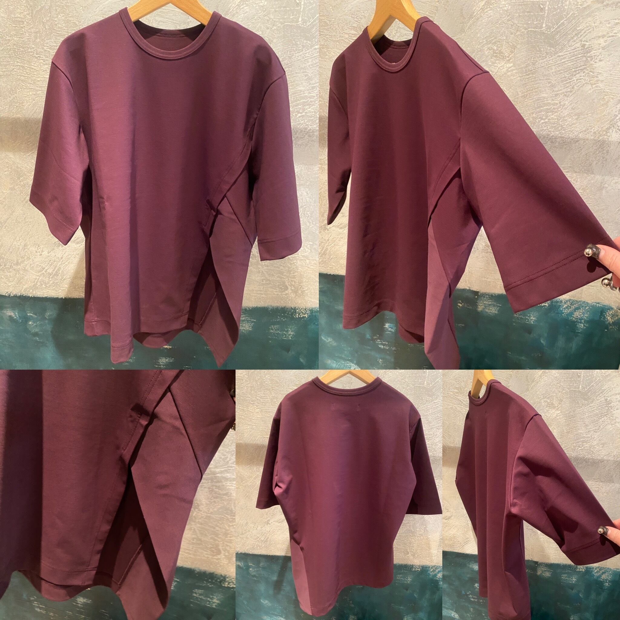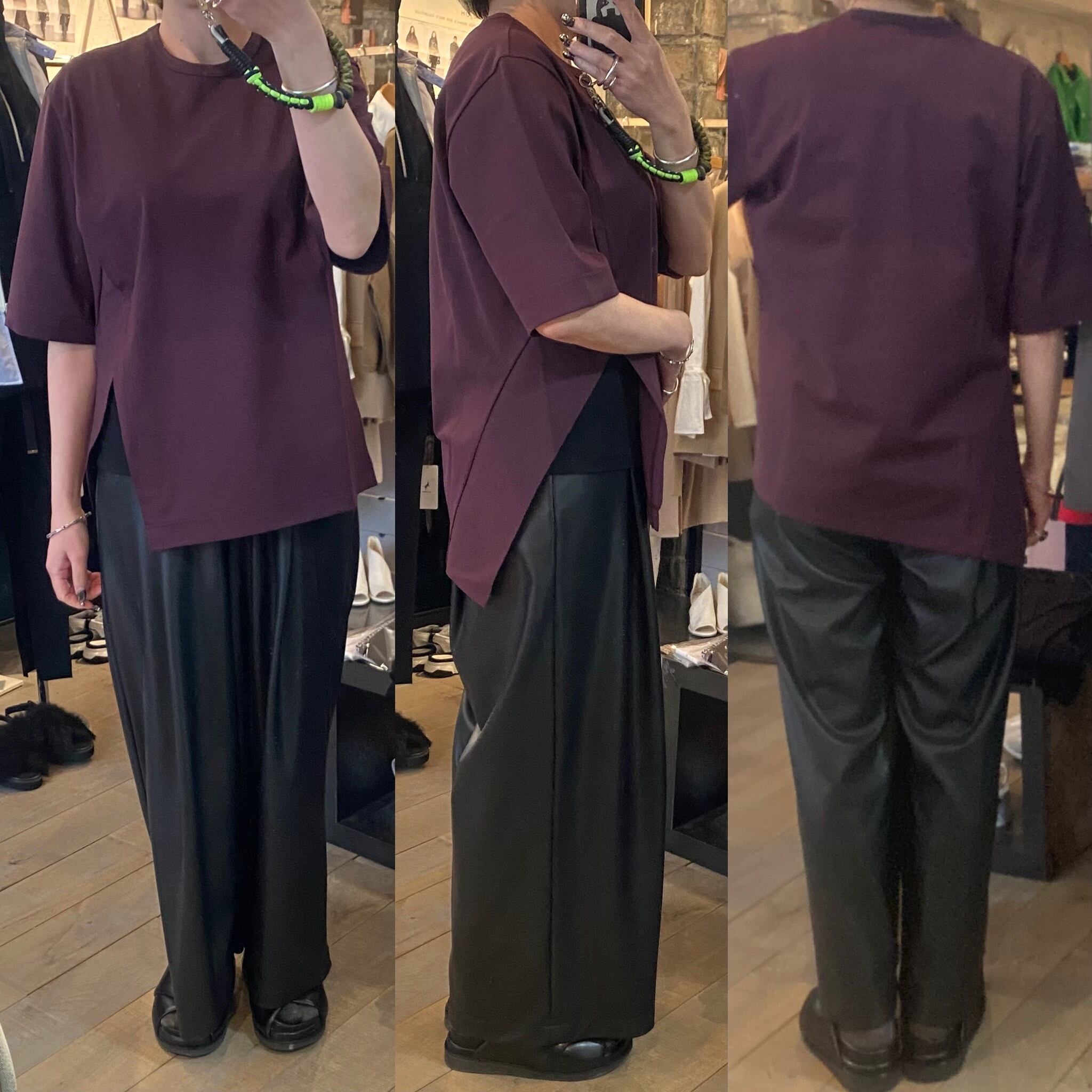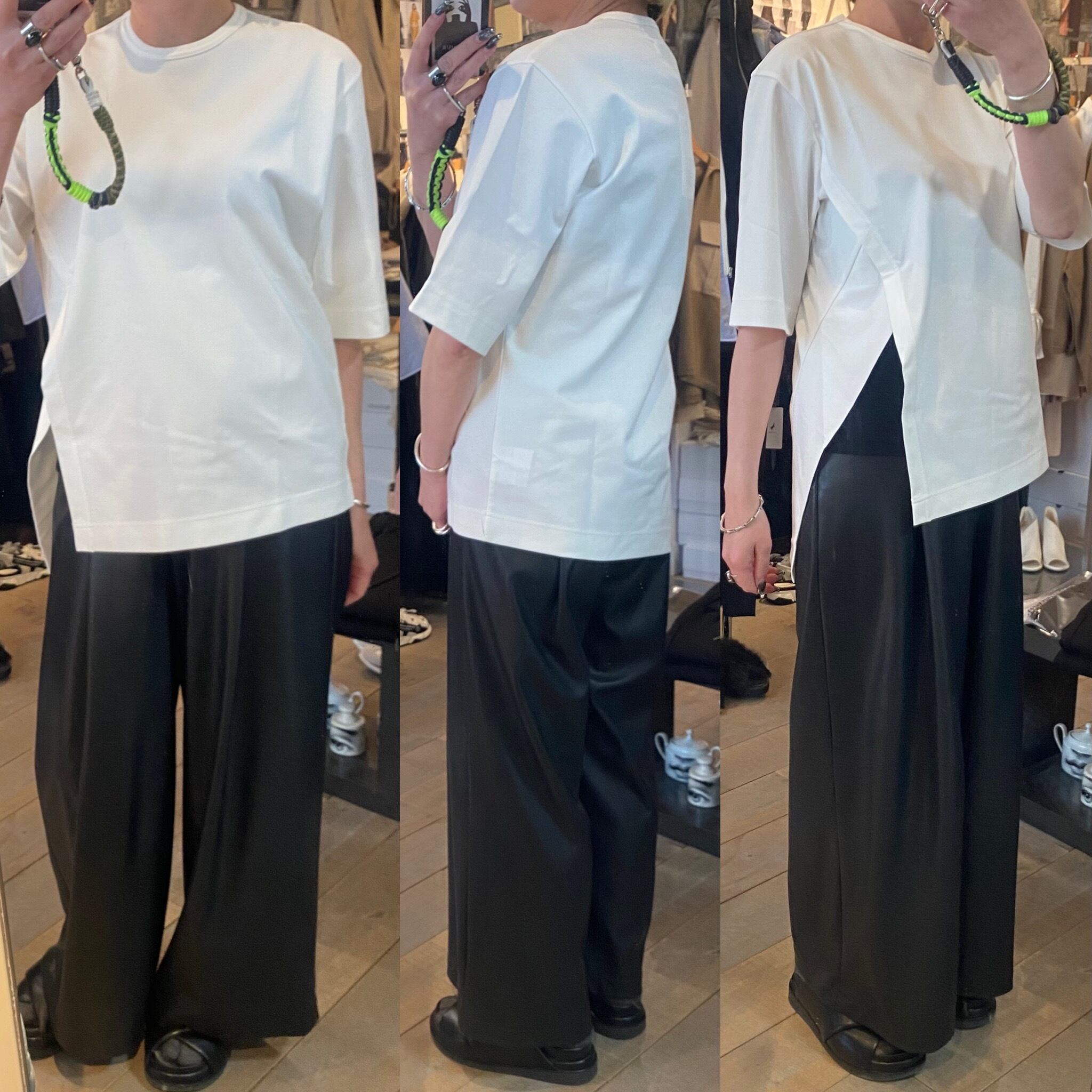 スーピマコットン100%を使用し、高密度に編み立てた素材です。高密度に編み込む事で生地にハリ、コシを持たせ、加工により強撚のようなシャリ感も感じる仕上がりの生地です。独特なラインでカッティングされた左脇のスリットが特徴的なカットソー。傾斜のついた裾と切替布がアクセントになっています。